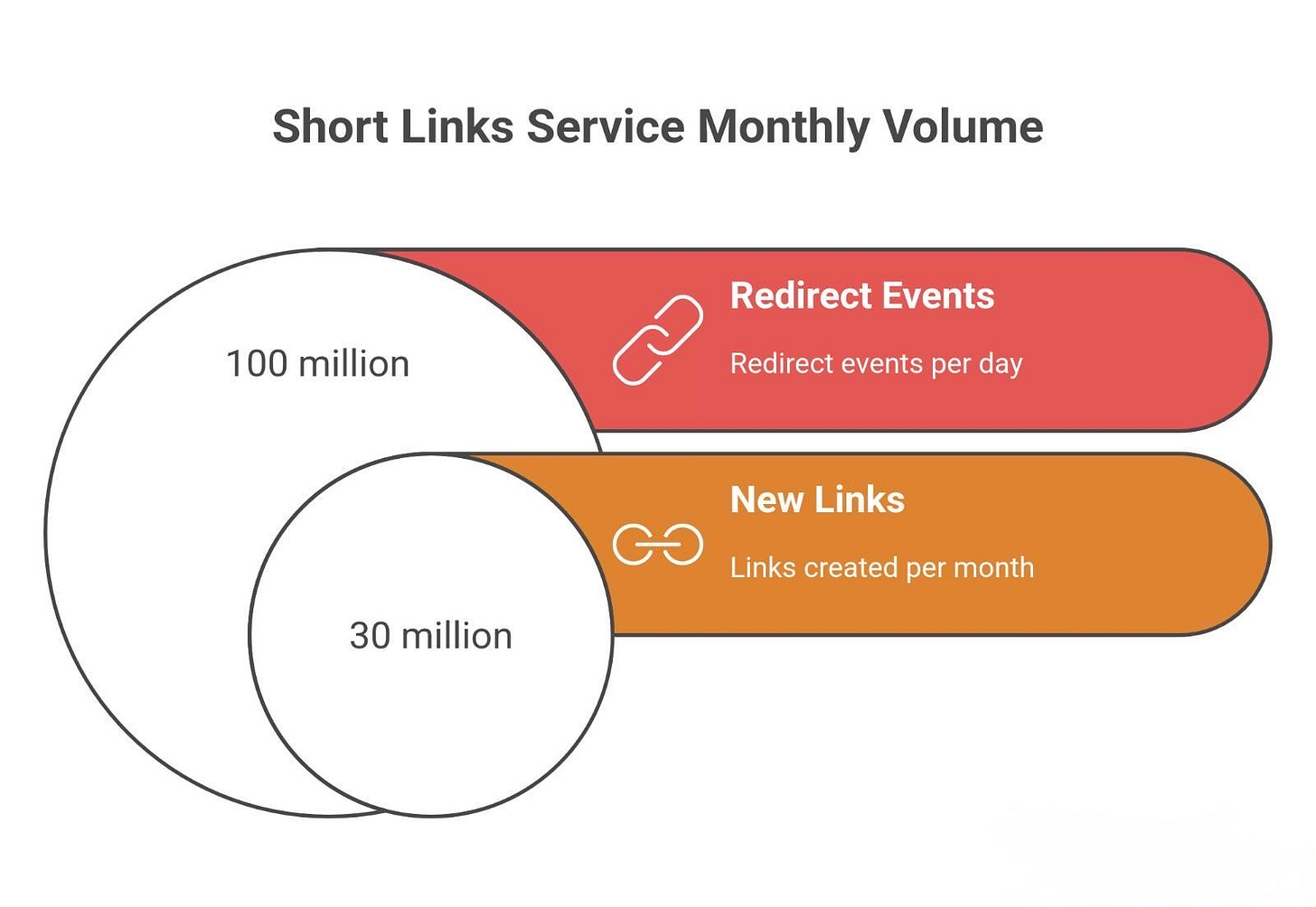 Suppose their service becomes moderately popular and handles about 30 million new short links per month.5 That’s roughly 1 million links per day. It’s ambitious but within reach for a global service (for context, this is smaller than Bitly’s 600M/month, but still significant). Over one year, that would accumulate to ~365 million links created.