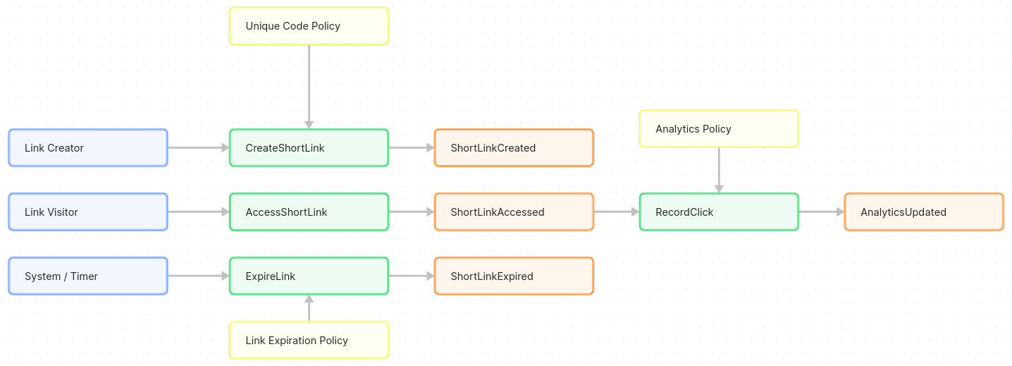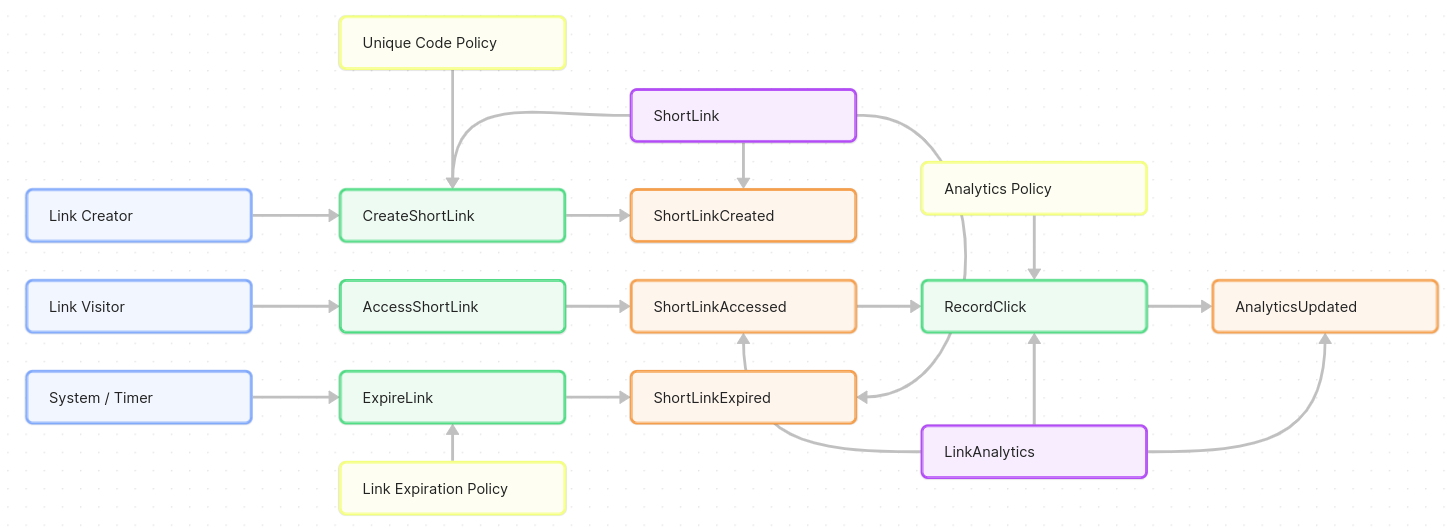 By identifying commands, they clarify what actions the system performs in response to user input or other triggers. For instance, CreateShortLink is invoked by a user inputting a URL to shorten; AccessShortLink is invoked when someone hits the short URL in their browser. Each command leads to one or more events (e.g., AccessShortLink → ShortLinkAccessed, plus maybe an Analytics event).