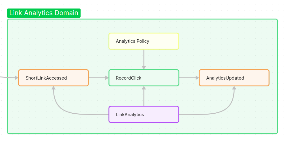 LinkAnalytics aggregate – representing the analytical info for a short link. This might be in a separate bounded context (see below). It could handle the RecordClick command and update click counts or other metrics, producing perhaps an AnalyticsUpdated event or updating a read model. In practice, LinkAnalytics might not be a single object but a process that tallies events for each link. For modeling, they treat it as an aggregate responsible for reacting to each ShortLinkAccessed event for a given link (e.g., incrementing a counter for that link).