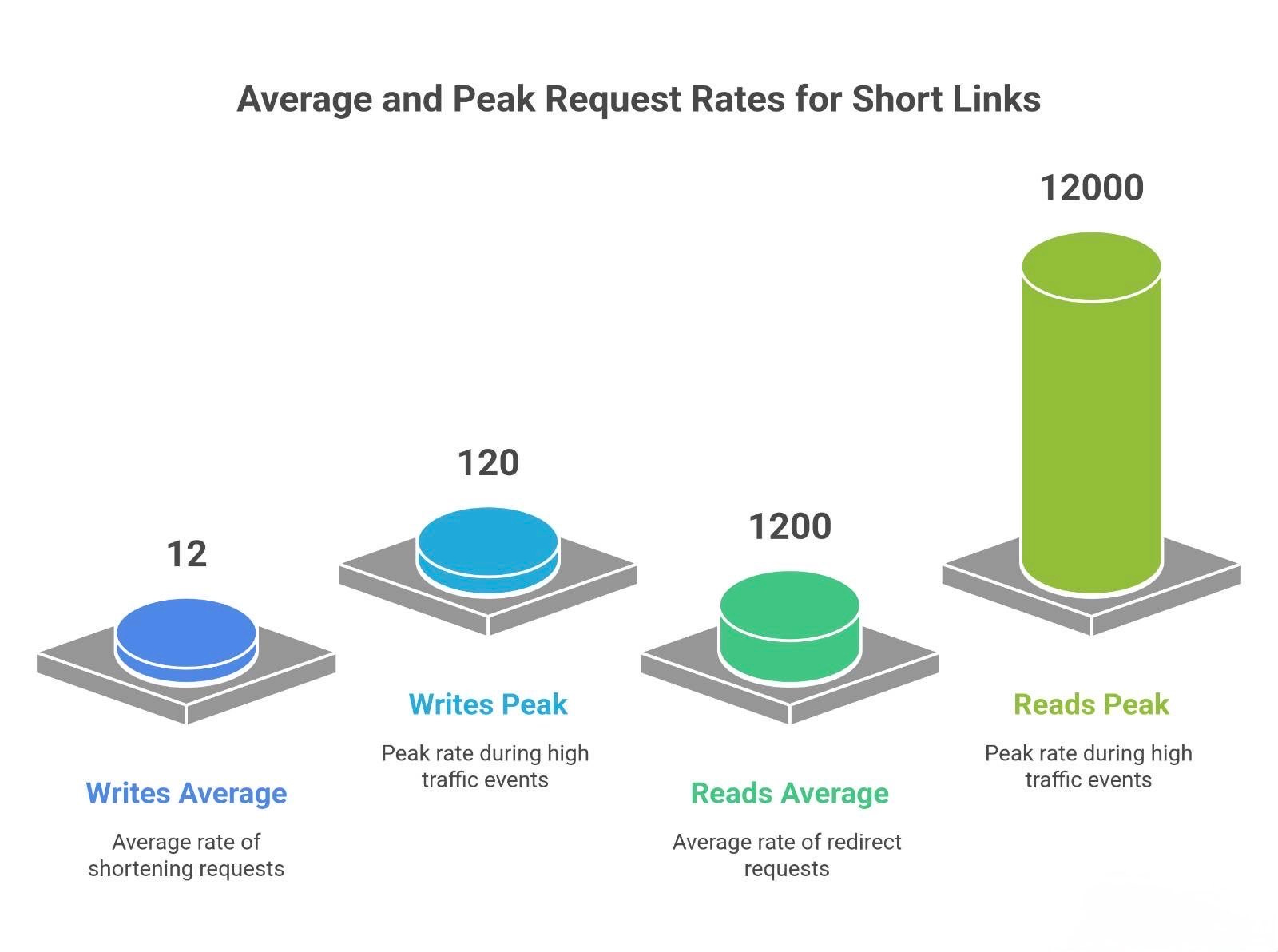 Reads (redirects): At 100:1 ratio, 100 million redirects per day is ~1,157 per second on average. Rounding, ~1,200 reads/sec average. Under 10× peak conditions, that’s ~12,000 redirects/sec at peak. 12k/sec is quite high – definitely need caching and a scalable datastore to handle that! It reinforces the earlier plan: most of these 12k lookups should be served from an in-memory cache (especially for the hottest links) to meet the latency and throughput goals. If 90% of requests hit cache, the database would only directly see ~1,200/sec, which is much more manageable.