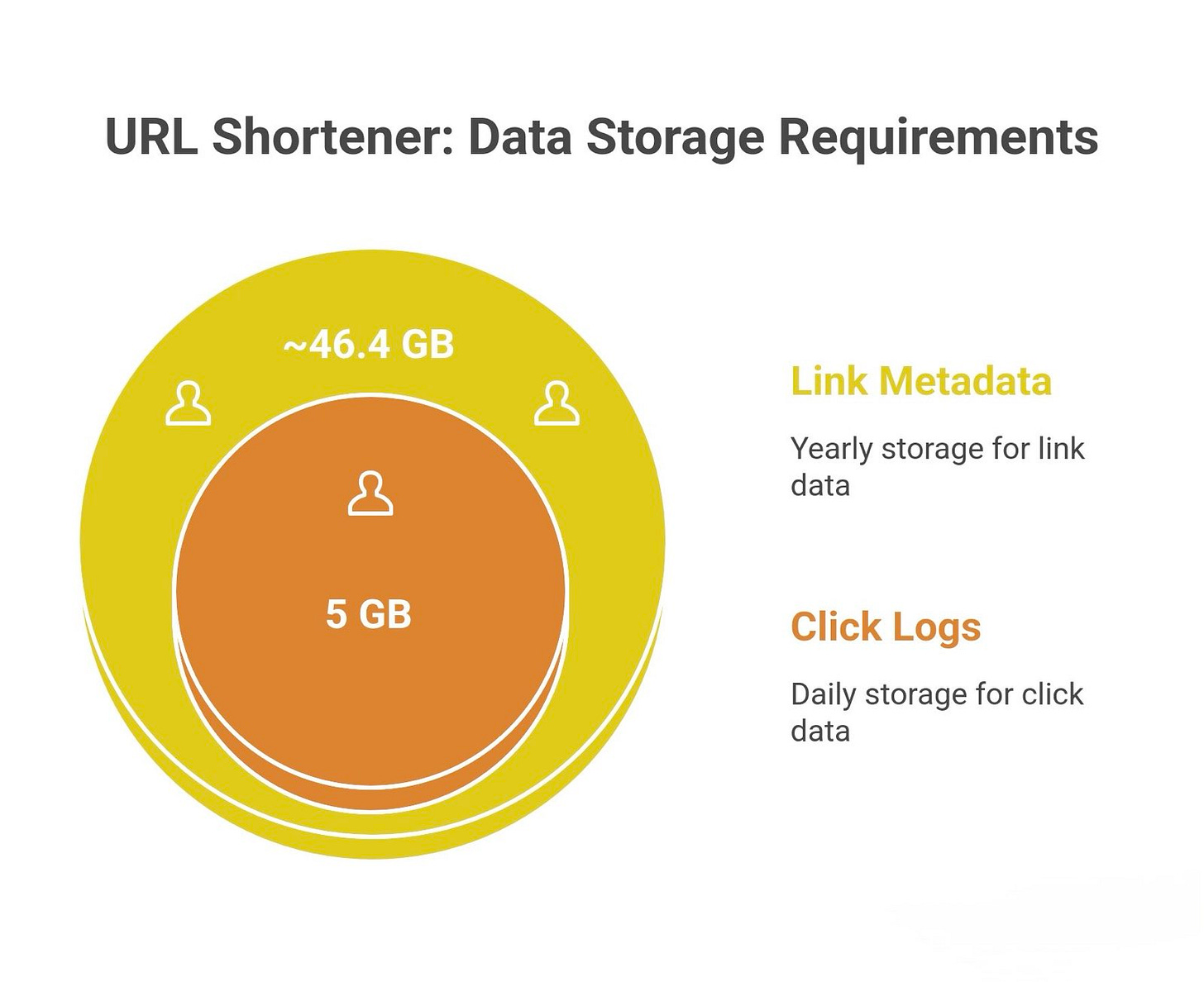 Link metadata storage: Each short link entry will store a short code and the long URL (plus some metadata like creation date, etc.). If we assume an average original URL length of ~100 characters (some URLs are longer, some shorter), plus, say, ~7 characters for the short code, and a few timestamps or counters, each record might be on the order of ~127 bytes (this matches an example calculation: 7 + 100 + 8 + 8 + 4 ≈ 127 bytes). At 365 million links/year, that’s roughly 46.4 GB per year of link data. Over 5 years, if growth is steady, it could be ~232 GB. If the system is successful and lives many years, this is significant but not astronomical – a modern distributed database can handle hundreds of gigabytes or more, especially when partitioned across nodes.