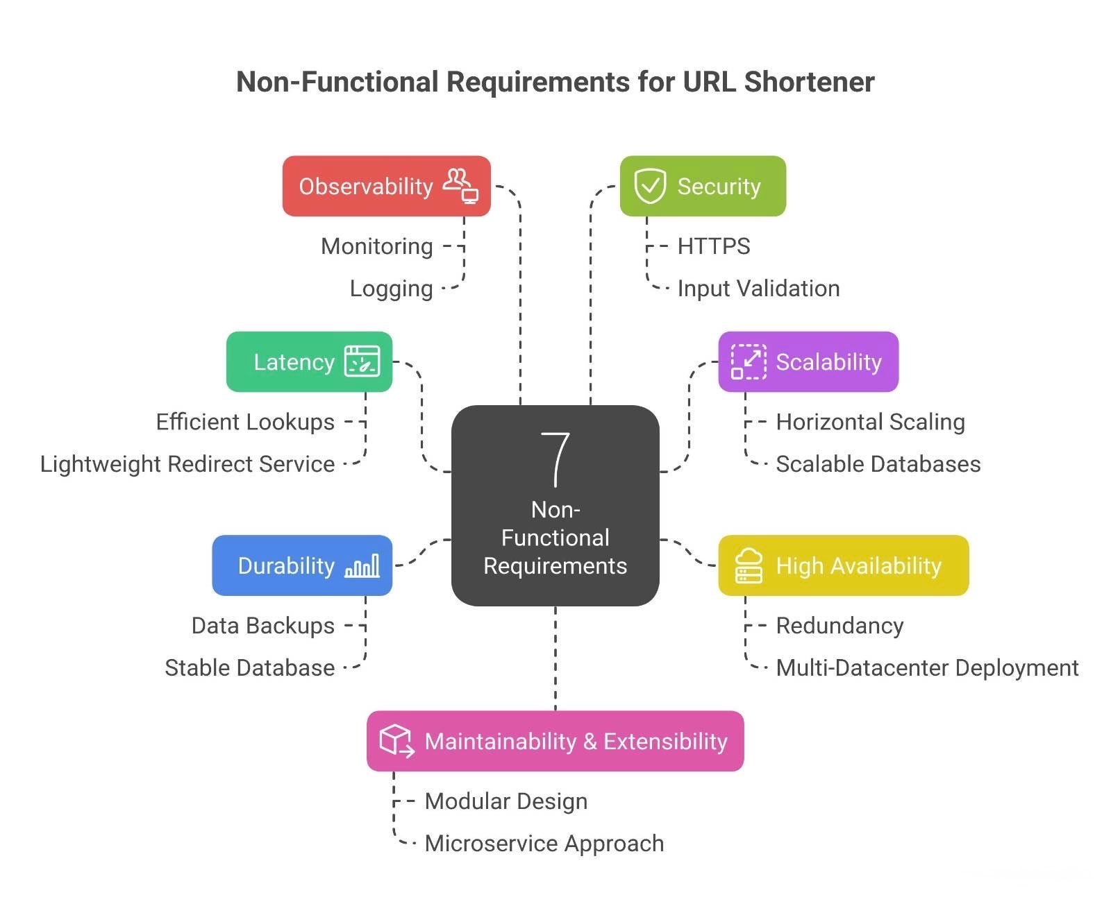 Before jumping into architecture, John insists they list the non-functional requirements – the crucial “-ilities” and qualities that their URL shortener must have. These NFRs will heavily influence their design decisions. Together, they come up with the following key NFRs (and note how each will shape the system).