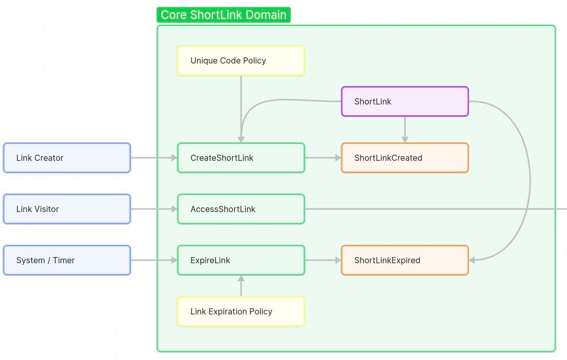Shortening Context (Core ShortLink Domain): This includes everything about creating and managing short URLs themselves. The ShortLink aggregate and related events (ShortLinkCreated, ShortLinkExpired) live here. It’s all about the link mapping and lifecycle.