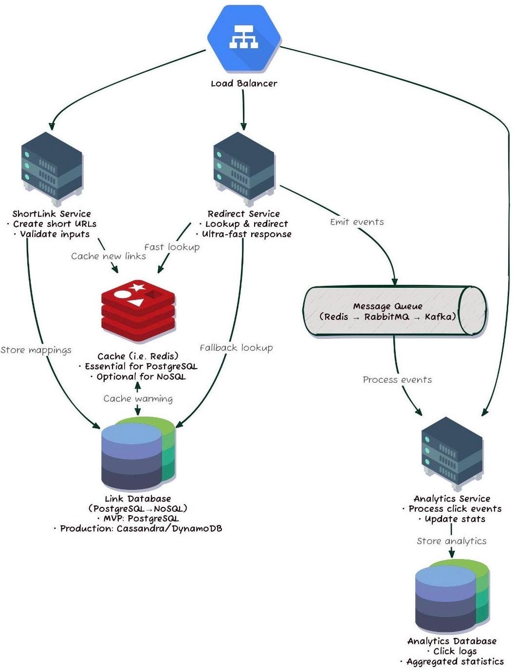 One thing I’m really curious about that wasn't fully addressed: cache invalidation for analytics. You mention updating a counter in the main ShortLinks table for the MVP. At high scale, that counter increment on every redirect could become a brutal write hotspot for a viral link, even with an async process. I’ve seen teams handle this by using probabilistic counters (like HyperLogLog for uniques) or a separate, write-optimized counters table that gets batched and merged into the main record later.