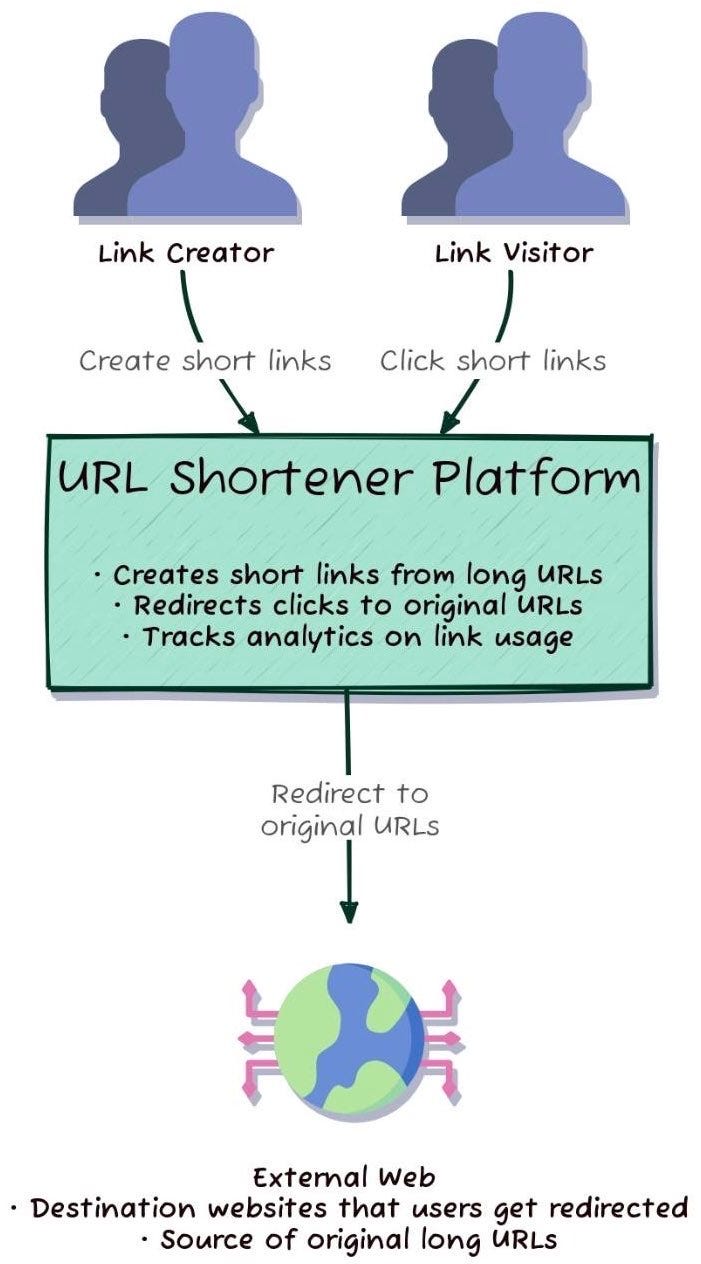 Link Creator – this is the user who shortens a URL (could be John, Peter, Andy, or any user of the service). They trigger the CreateShortLink command.