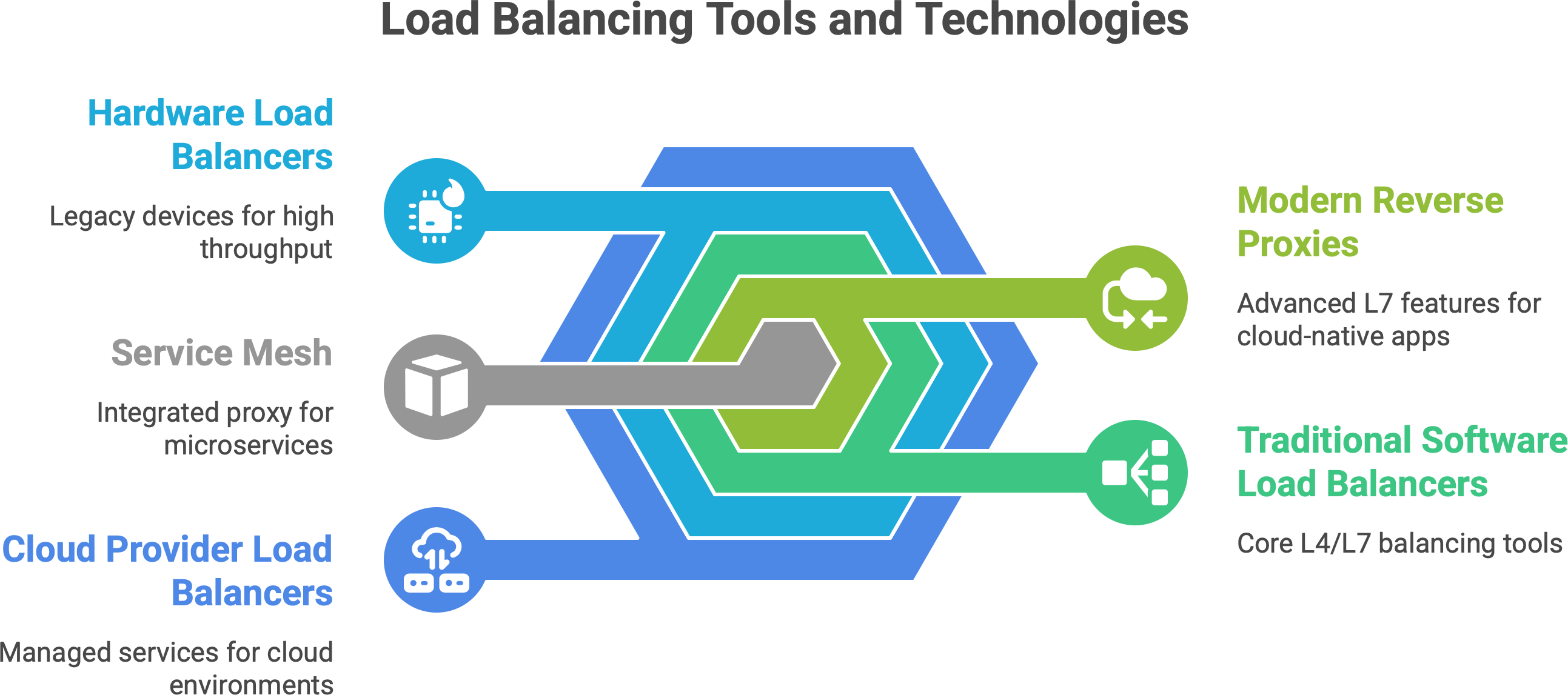 Service Mesh proxies (Envoy via Istio/Linkerd) bring load balancing into each service instance for microservice architectures, enabling very fine-grained control and reliability techniques.
