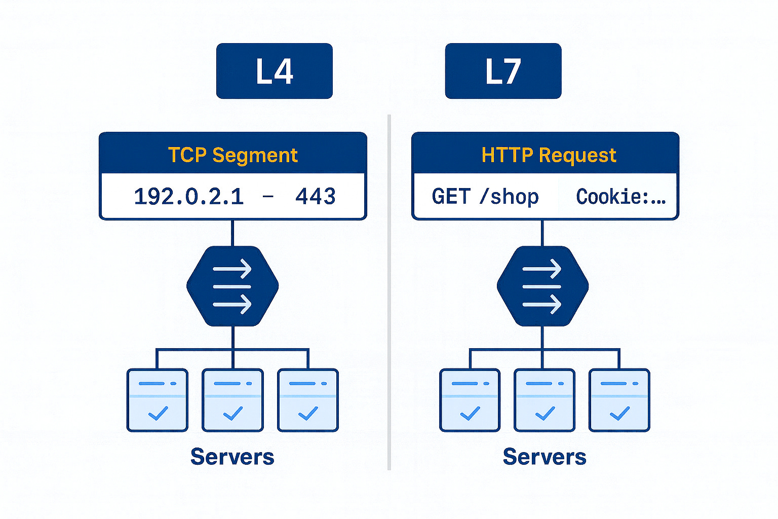 L7 (application) for smart routing based on HTTP content, cookies, etc., albeit with slight overhead.
