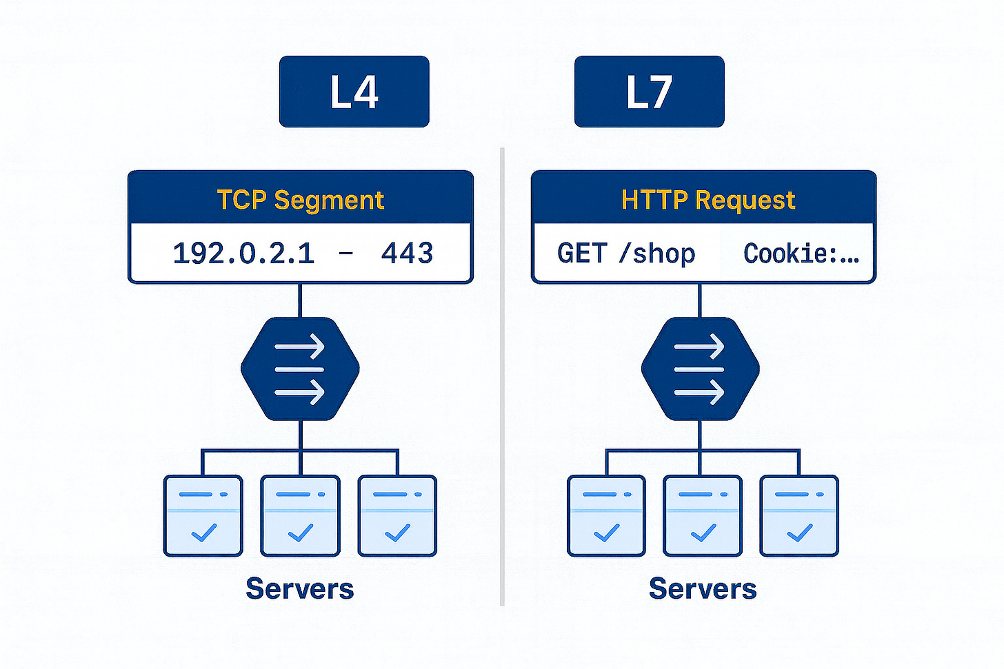 Layer 4 (Transport layer) Load Balancing. This operates at the TCP/UDP level. A Layer 4 load balancer routes traffic based on low-level info like IP address and port, without understanding the content of the request.3 It’s essentially doing packet forwarding. Think of it as fast and dumb – it just knows “this packet goes to Server 1, next to Server 2”, etc., and doesn’t peek inside the HTTP request. Because it’s simple, it’s very high-performance (blazingly fast). Classic network appliances and some cloud load balancers (like AWS Classic ELB or Network LB) work at L4, as do tools like HAProxy in TCP mode. An L4 balancer can’t, for example, route traffic based on an HTTP URL – it just sees addresses and ports.4 But it’s great for raw speed and is often used for lower-level balancing of non-HTTP protocols or as a first-line balancer for lots of connections.