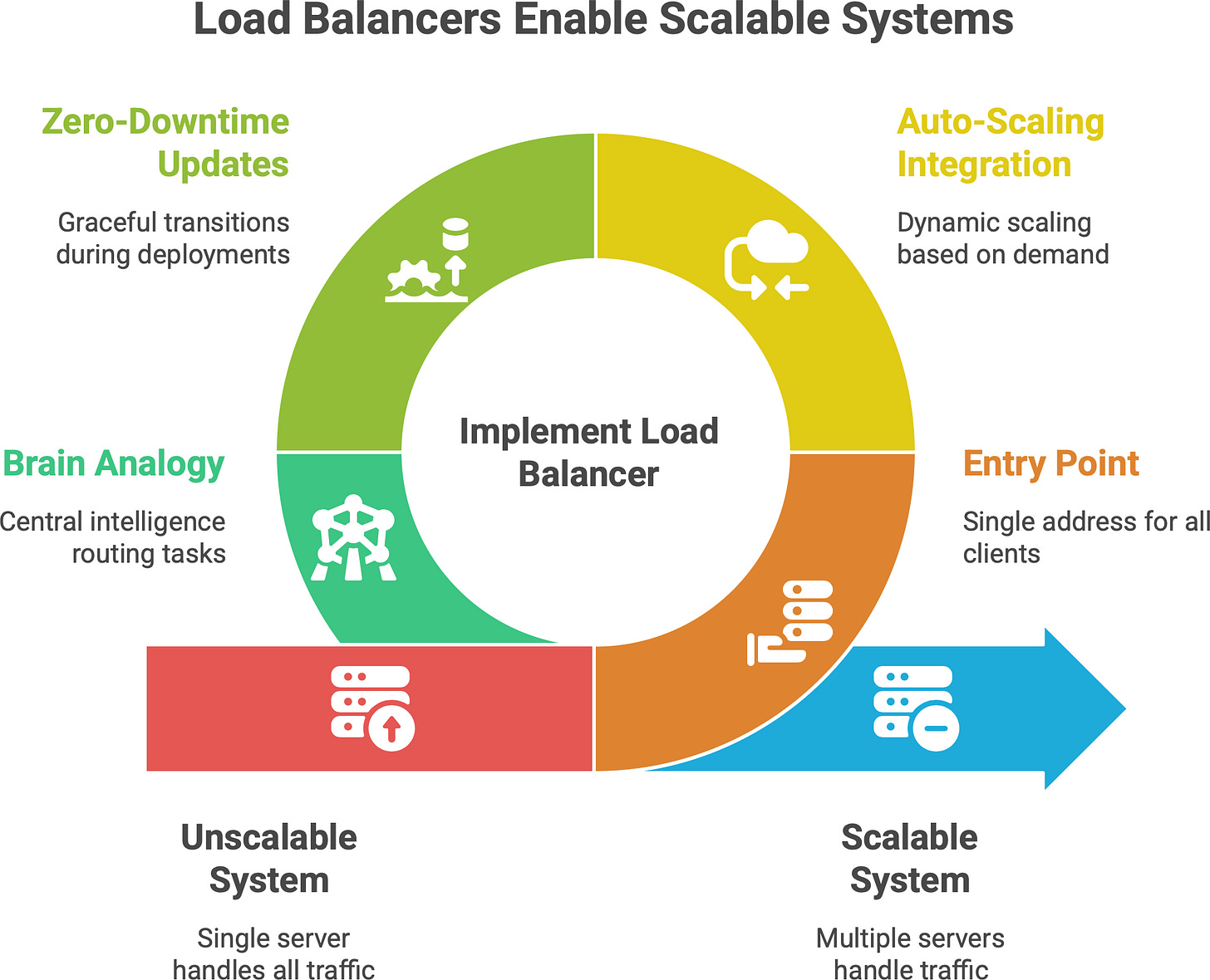Brain Analogy: A nice way to view it: The load balancer is the brain that decides where the current flows. If scaling is adding more “limbs” or “muscle” to handle work, the load balancer is the nervous system routing tasks to those muscles. Without it, adding more servers wouldn’t automatically help (how would users know to go to the new server?). With it, you have a central intelligence distributing tasks so that all your capacity is utilized.