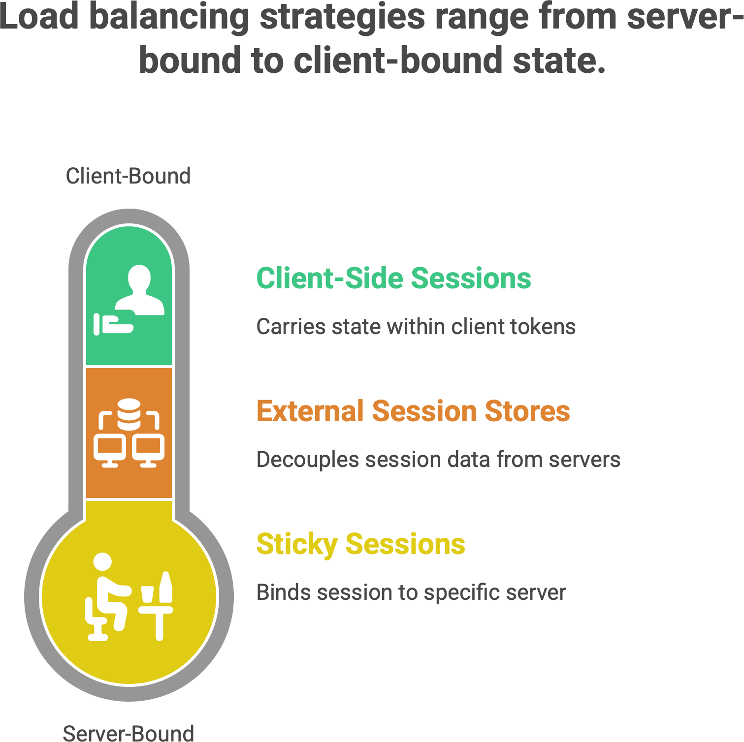 External Session stores. A more scalable approach is to decouple the session data from any single web server. Instead of storing session info in each server’s memory, store it in a shared place that all servers can access. This could be a database, a distributed cache like Redis or Memcached, or another dedicated session service. Then any server can handle any request because they all consult the central session store. For instance, in a PHP app, you might configure sessions to go to a Redis cluster. Or in Java, use a shared database or in-memory data grid. This way, it doesn’t matter which server the load balancer picks – the user session is the same. Pro: You regain full load balancing freedom; truly any request can go anywhere, and losing one server doesn’t drop sessions (they’re in the central store). Con: The central session store can become a new bottleneck or point of failure if not managed (though these systems are usually made robust). Also, there’s a performance cost to reading/writing session data over the network. But in practice, many large systems use this approach because it keeps the web tier stateless. In our restaurant analogy, this is like writing down the order and customer preferences in a central book that any chef can read – so even if the customer moves to a different table, the new chef can pick up where the last left off.