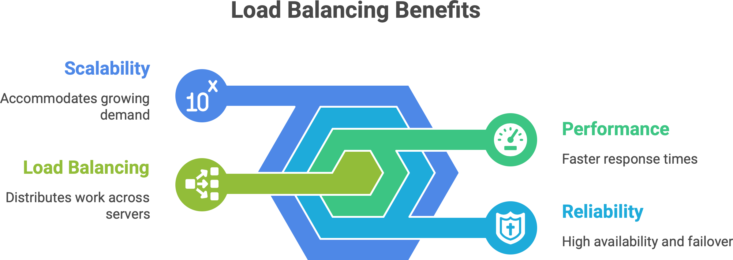 Performance. No single server gets overwhelmed and slow. By sharing requests, the system can respond faster. In fact, a load balancer ensures no one server bears too many requests, which directly improves application speed and responsiveness.2