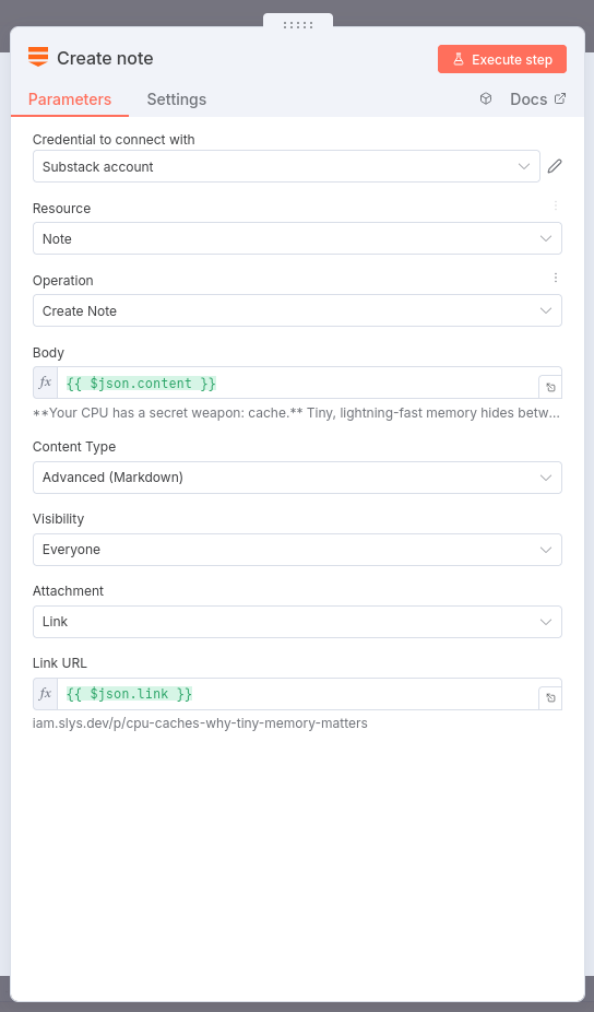When everything is wired up, the Substack node will take that note text and publish it to my Substack account as a new Note. 🎉 Because I wrote the note in Markdown (in the Google Sheet), and Substack Notes support formatting, I didn’t need to modify the text at all – it could include links, bold/italic, etc., and it would appear formatted correctly on Substack. The Substack node handles sending this off to Substack’s servers. Under the hood, it’s making the same kind of request your browser would if you posted manually, just automated.