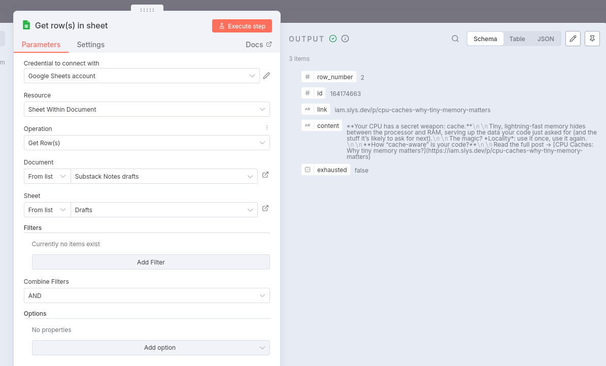 However, I don’t want to post all of them at once – I just need one per run. Also, I want to avoid posting any note that’s already been posted before. That means I need to filter out any rows that are marked “exhausted” (i.e., already used). To handle that, I added a small filter in the workflow.