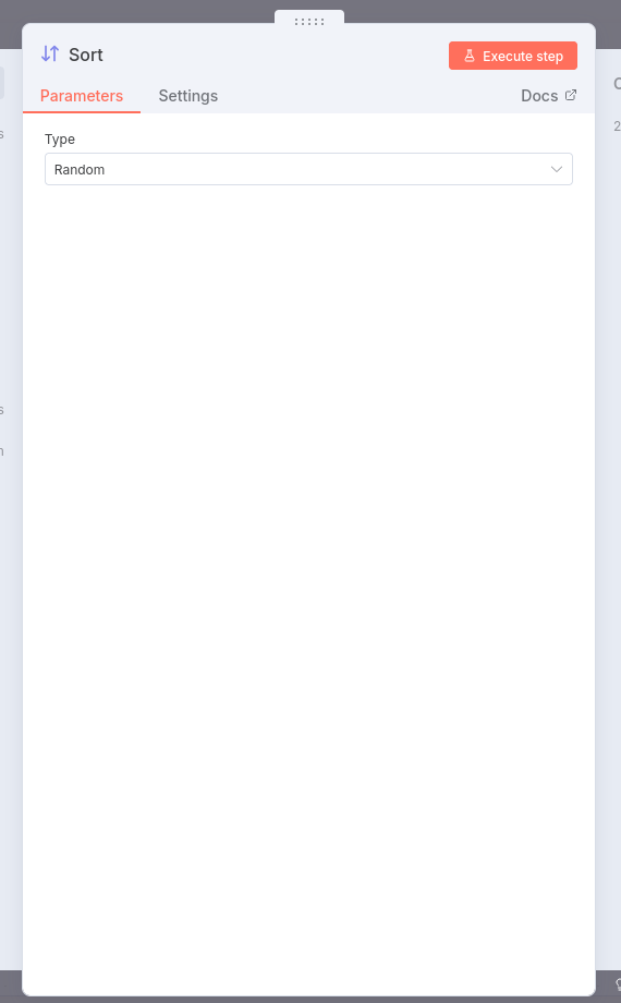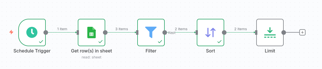 I wanted the selection to feel a bit random – I didn’t necessarily want to always post them in the same order as they appear in the sheet. To achieve this, I added an Sort node to do a little trick: randomize the order of the items.