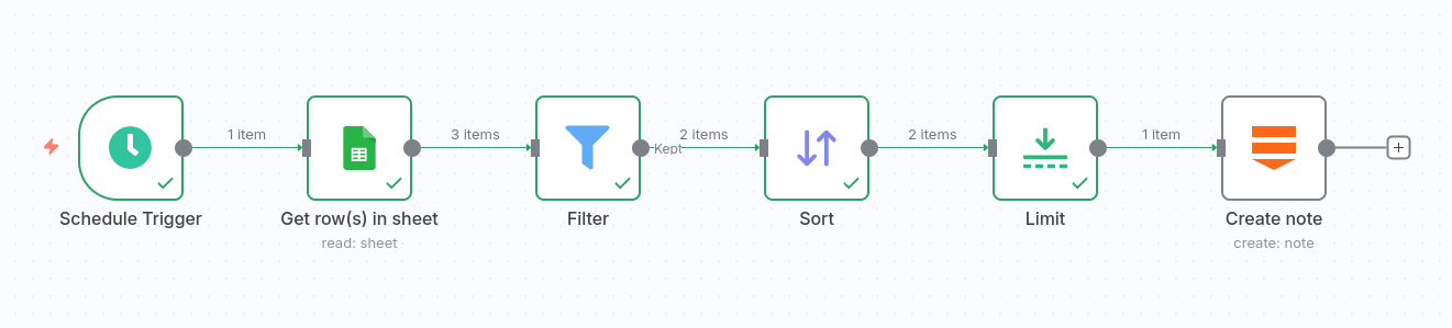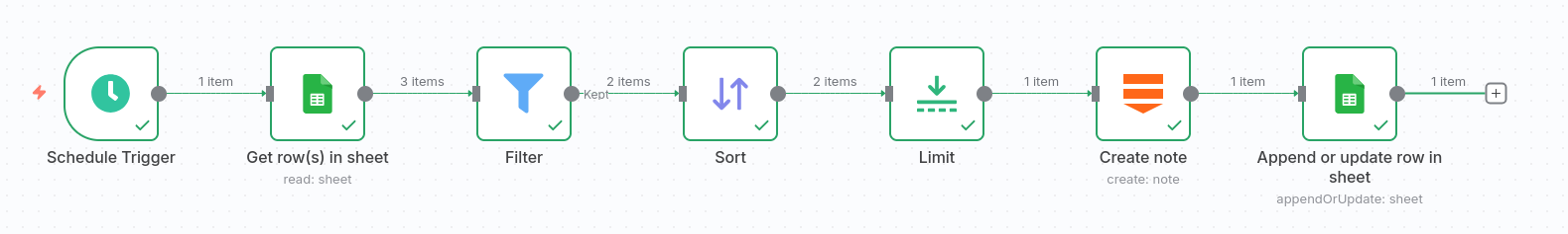 Schedule trigger node. I used n8n’s Schedule trigger to run the workflow on a regular schedule (every few hours in my case). This ensures notes get posted consistently without my intervention.