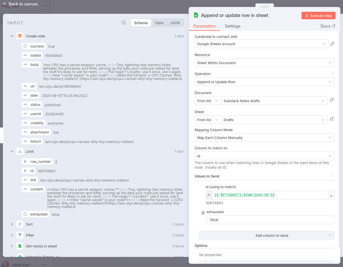 I dynamically set the key value to match the note we just published. The ID is retrieved from the Limit step to match the ID from the Google Sheet item.