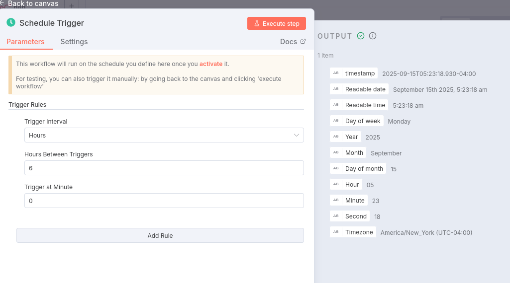 I added a Schedule node as the start of my workflow and configured it to run every few hours. In my case, I set it to run roughly every 6 hours, so I’d get a few notes posted throughout the day without me intervening.