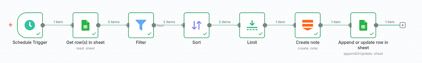 When this node runs, it will fetch all the rows from my draft sheet. In n8n, the output of this node is a list of items (each item corresponds to one row/note, with fields for each column). So at this point in the workflow, I have an in-memory list of every draft note that’s in the Google Sheet.