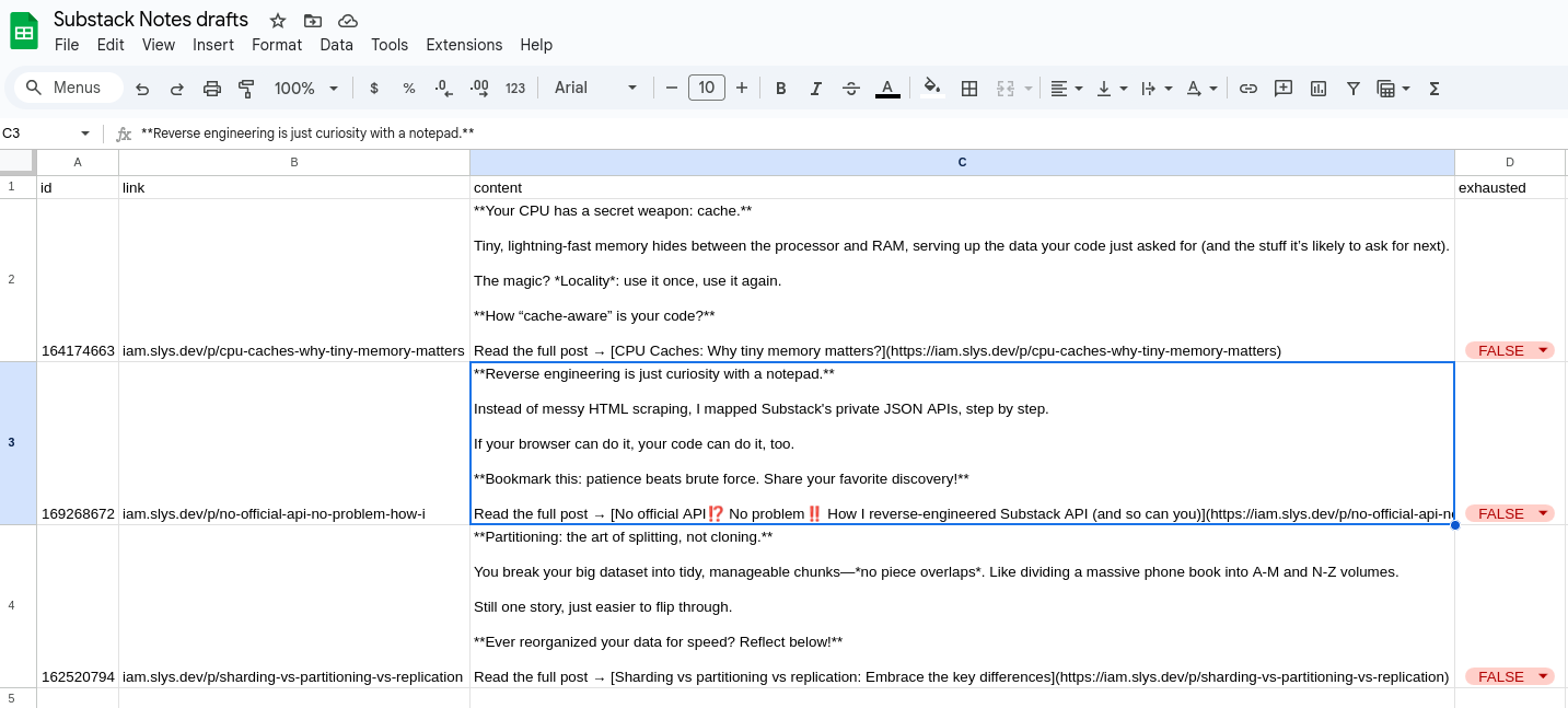 In this sheet, I have four main columns: one for the Note Id (identifies the draft uniquely), one for the Note content (written in Markdown for formatting), one for the Exhausted (to mark if a note has been posted) and one for the link to a post. Initially, I filled the sheet with a bunch of ideas and drafts for my Substack Notes. These are short paragraphs – things like interesting quotes, quick updates, or questions for my audience. By writing them in Markdown, I can include italics, bold, or links as needed, since Substack node support basic Markdown formatting.