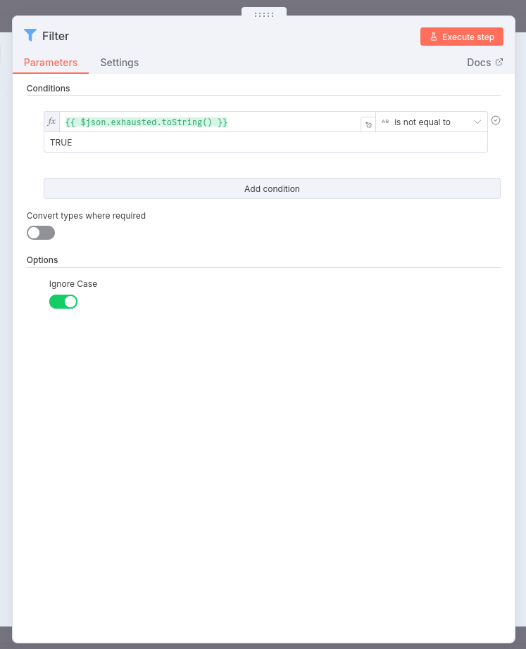 After reading the rows from the sheet, I introduced an Filter node in n8n to help filter out used notes. The Filter node is configured to check the “Exhausted” field of each item. If the status is "true" (or whatever keyword I use to mark a used note), the Filter node will categorize that item is not to be used. I used toString() method to make sure n8n is able to compare value correctly.