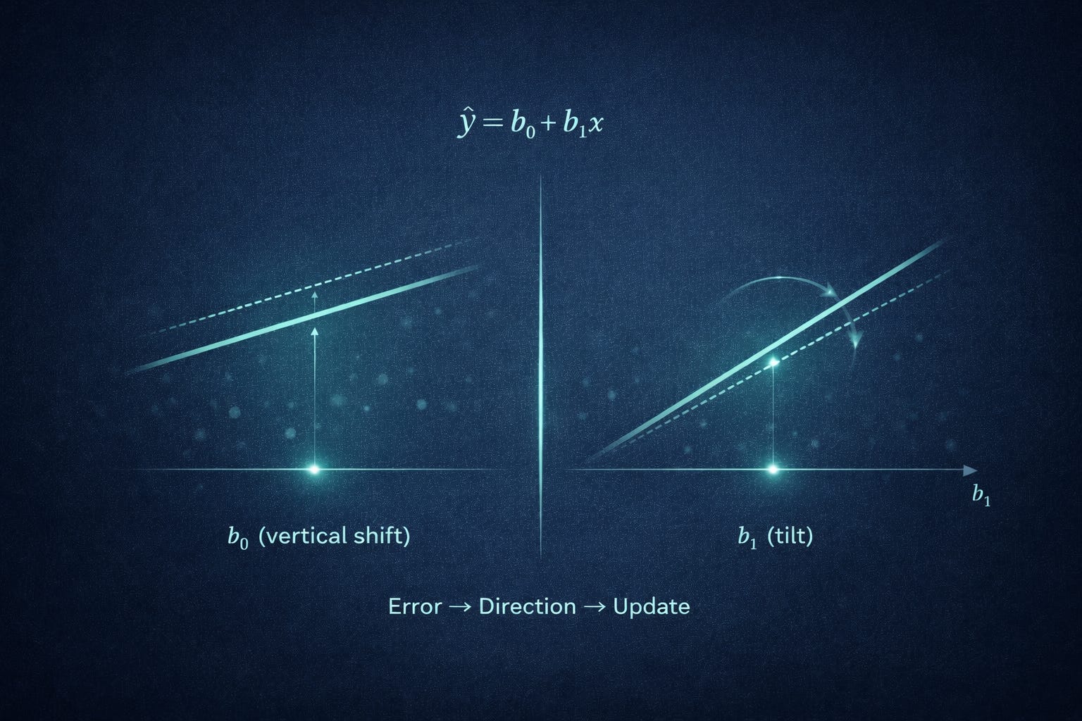 Then you might notice something else: perhaps the line is now consistently too low overall. That would show up as many positive residuals across the board, suggesting the intercept should increase. Training becomes a repeated, almost conversational adjustment: tilt, shift, re-check. Not until it’s perfect - until further adjustments stop making meaningful improvements.