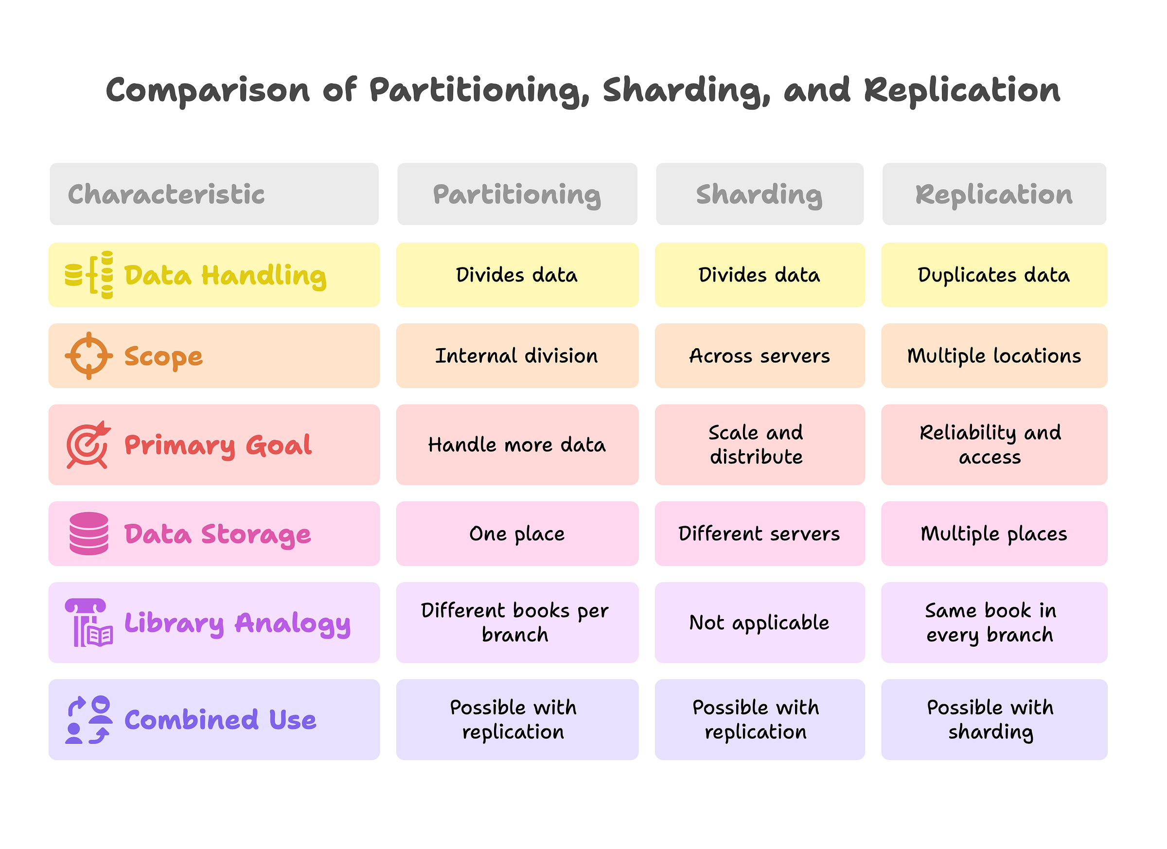 Now that we’ve defined partitioning, sharding, and replication, let’s compare them side by side and address some common points of confusion: