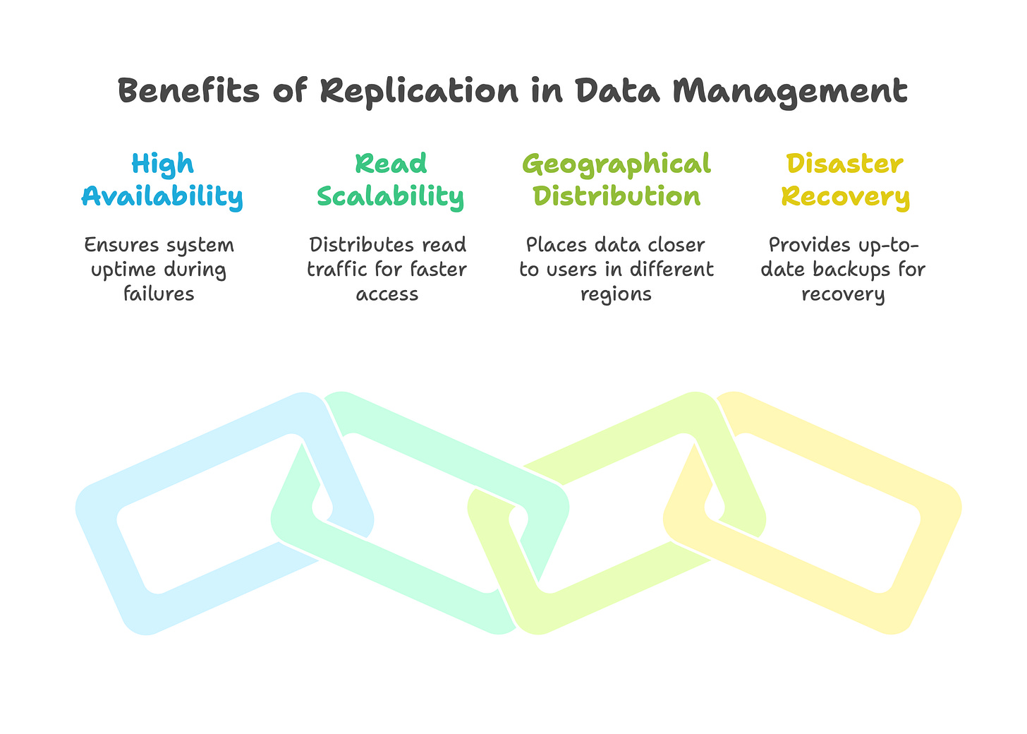 Disaster Recovery. Replication provides an up-to-date backup. If a data center is hit by a disaster (fire, flood), a replica in another location still has all the data. This greatly improves the ability to recover without data loss.