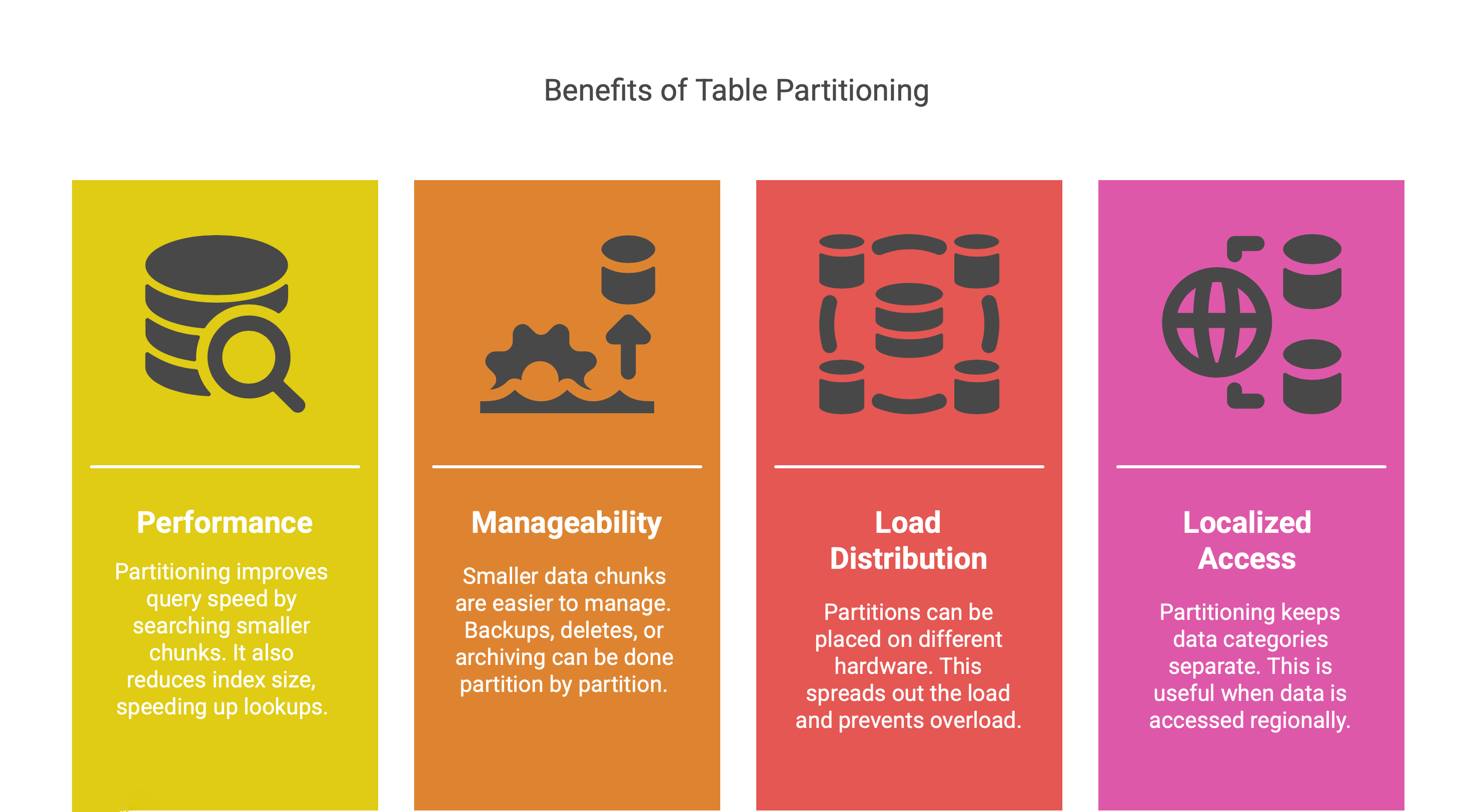 Performance with Large Data. When a single table becomes too large, partitioning it can improve query speed. For example, searching within one smaller partition is faster than searching a huge single table. It also reduces index size, which can speed up lookups.