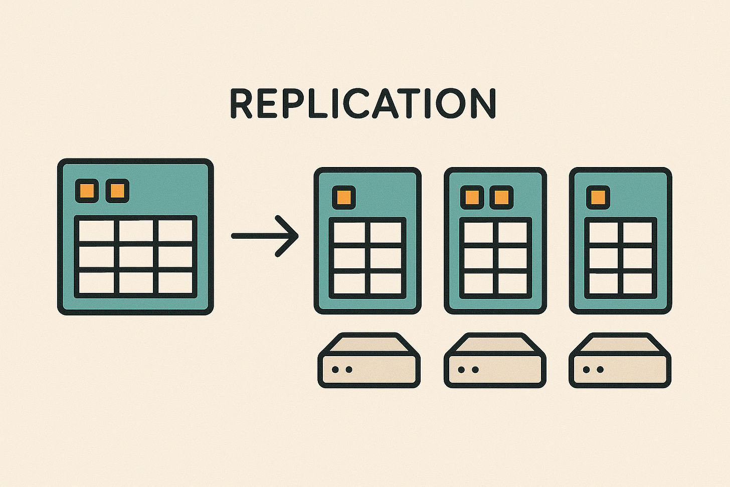 Replication means making copies of data on multiple machines or locations. Instead of each piece of data being stored in only one place (as with partitioning/sharding), replication stores the same data in two or more places3. If partitioning is like splitting a pie into slices, replication is like baking multiple identical pies. In databases, replication is often used so that if one database server fails, another copy (on a different server) can take over with the same data. The data on replicated servers is kept in sync (updated) so that each copy is nearly identical at any given time.