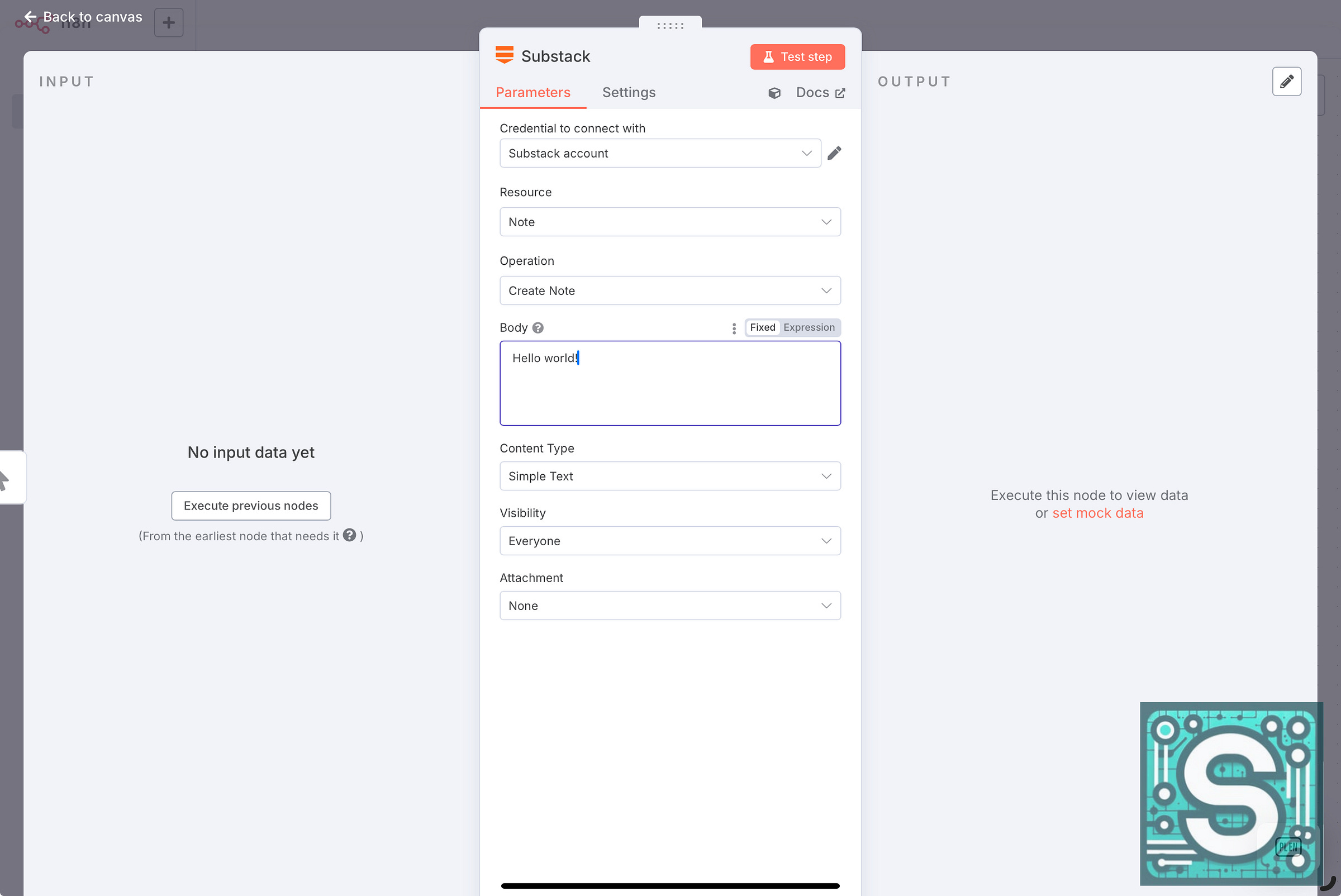 Step 2: Next, add a Substack node and connect it to the Manual Trigger. In the Substack node’s settings, set the Resource to “Note” and the Operation to “Create”. You’ll see field appear for “Body” – this is where you compose your note.