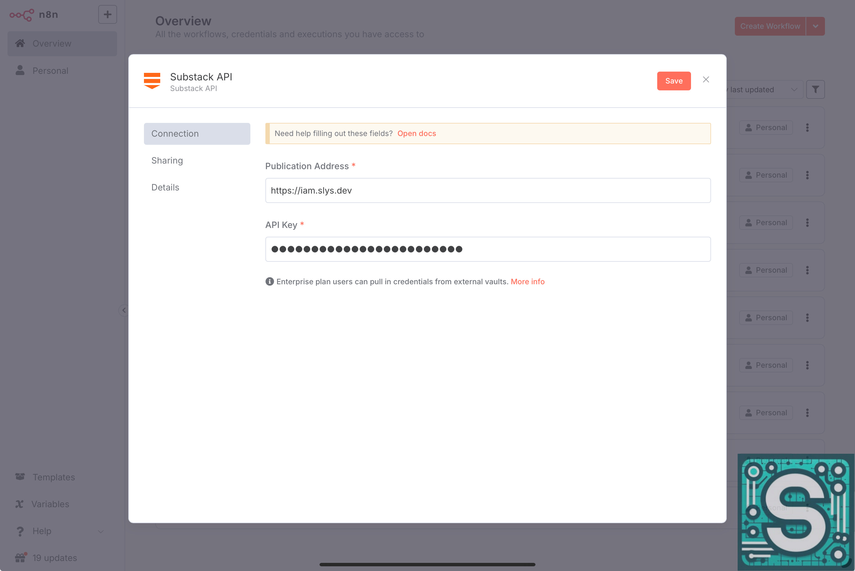 Create Substack credentials in n8n. Back in n8n, add a new credential for Substack (if you drag the Substack node into a workflow, you’ll be prompted to select or create credentials). It will ask for two things: your Publication Address and API Key. Enter your Substack URL (e.g. mynewsletter.substack.com) as the address, and paste that long cookie value as the API Key. Save the credential.