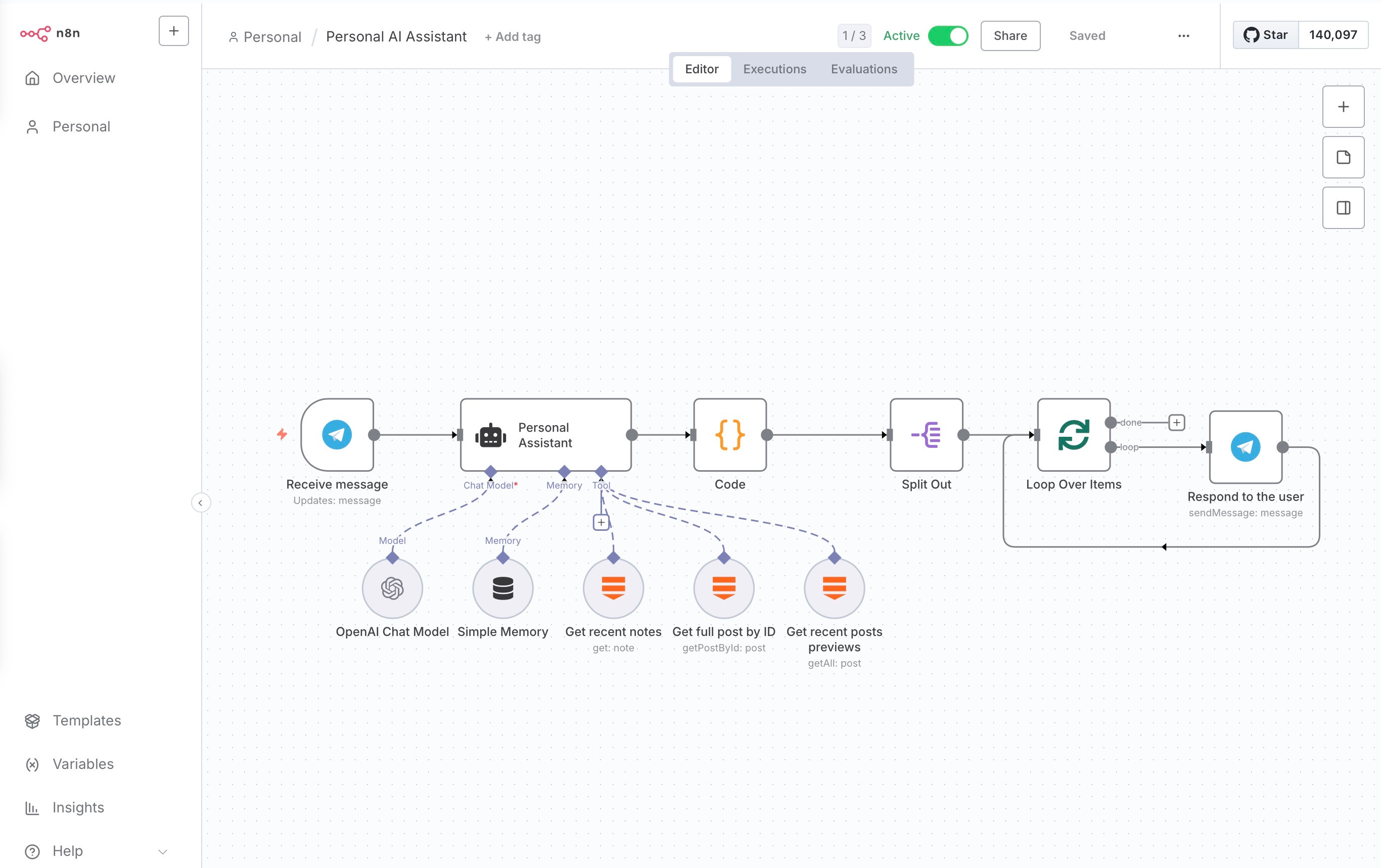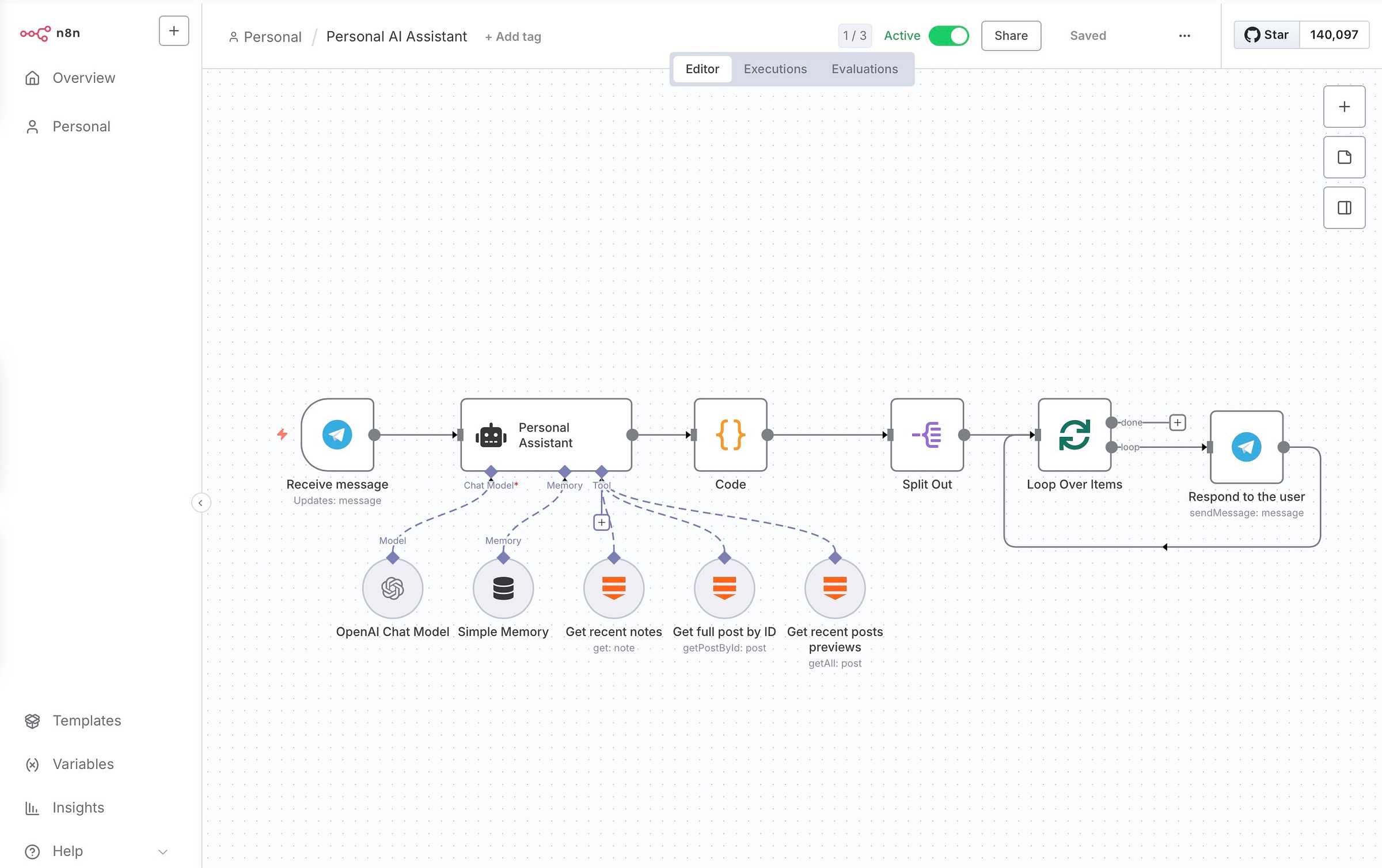 Iโve always loved writing ๐, but lately I was drowning in ideas and struggling to organize my newsletter content. I was reading about n8nโs1 AI capabilities and realized I could automate some of my workflow. n8n even has a Telegram2 AI bot template3 where a LangChain agent talks to GPT-4. Inspired by that, I decided to build a Telegram bot assistant that pulls in my Substack newsletter posts and helps me brainstorm new ideas.