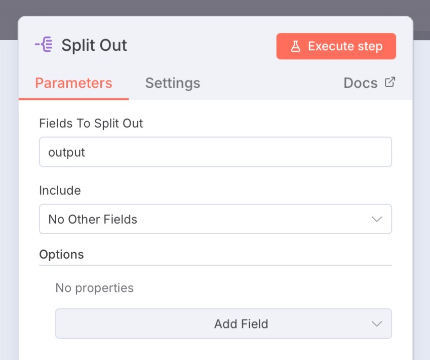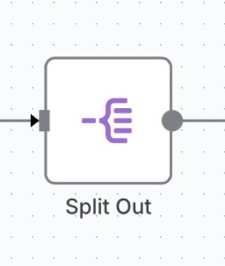 Next, a Split Out node takes that array of text chunks and splits them into separate โitemsโ in n8nโs workflow.