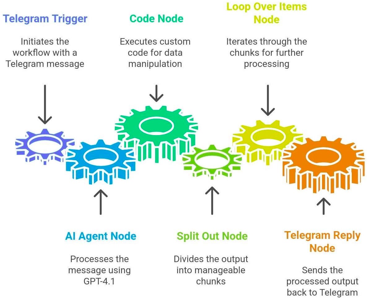 On each loop iteration, it takes the next text chunk and passes it to the Telegram reply node. In n8n terms, this ensures the messages are sent sequentially so nothing gets lost. Itโs basically a loop that says โfor each piece of text, do the next stepโ.