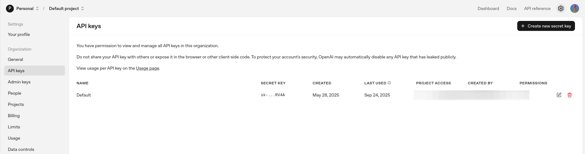 Go to OpenAI Platform and sign up or log in. In the dashboard, click your account icon and select API keys. Then click Create new secret key to generate a key. Copy that key (you wonโt be able to see it again) and add it as credentials in n8n. This lets the AI Agent node call GPT-4.1 via OpenAIโs API.