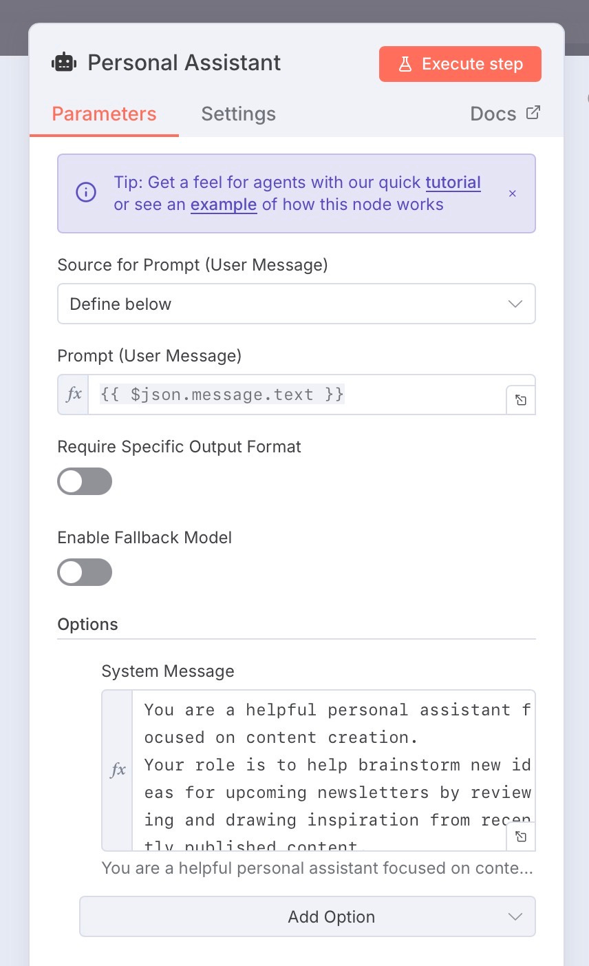 Next is the AI Agent node. I set it up as a conversation agent with a custom system prompt that tells it to focus on content brainstorming. Here is the system prompt I have provided.