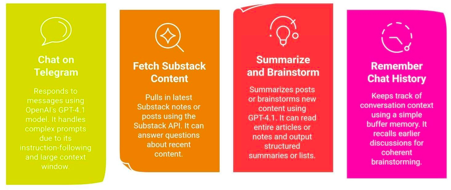 Putting this all together, I ended up with a smart, Telegram-based assistant for my newsletter work. It responds to my messages, knows my recent Substack content, and helps me generate or refine ideas. The AI agent, armed with GPT-4.1 and a memory buffer, can chat naturally and reference past notes. And by chunking outputs for Telegram, nothing gets cut off.