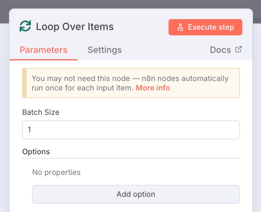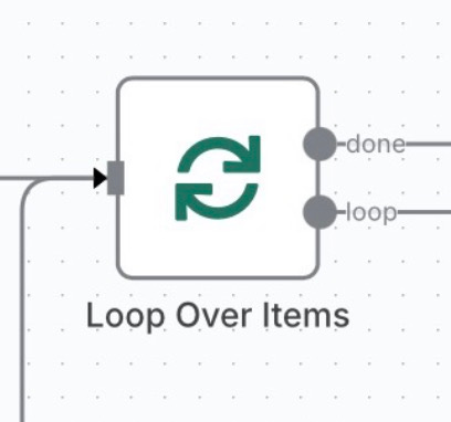 Now I use a Loop Over Items node to handle each chunk one by one. This node goes through each split message in order.