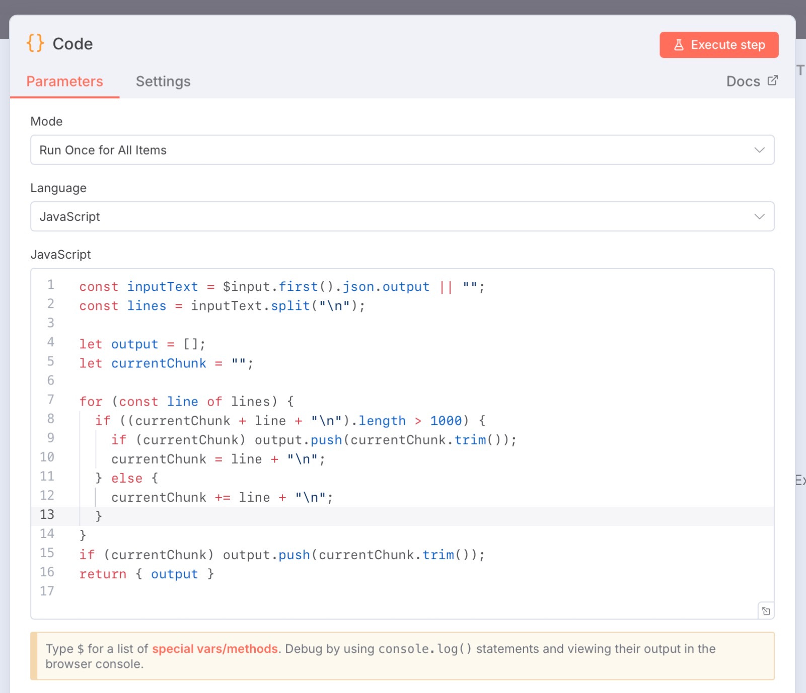 This node runs a bit of JavaScript that takes the agentโs output text and breaks it into an array of chunks, each under 1000 characters.