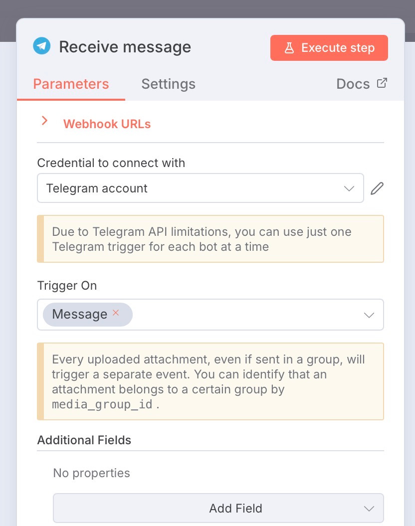 Essentially, it says โNew input from Telegram: here is the userโs messageโ, so the workflow knows to react.