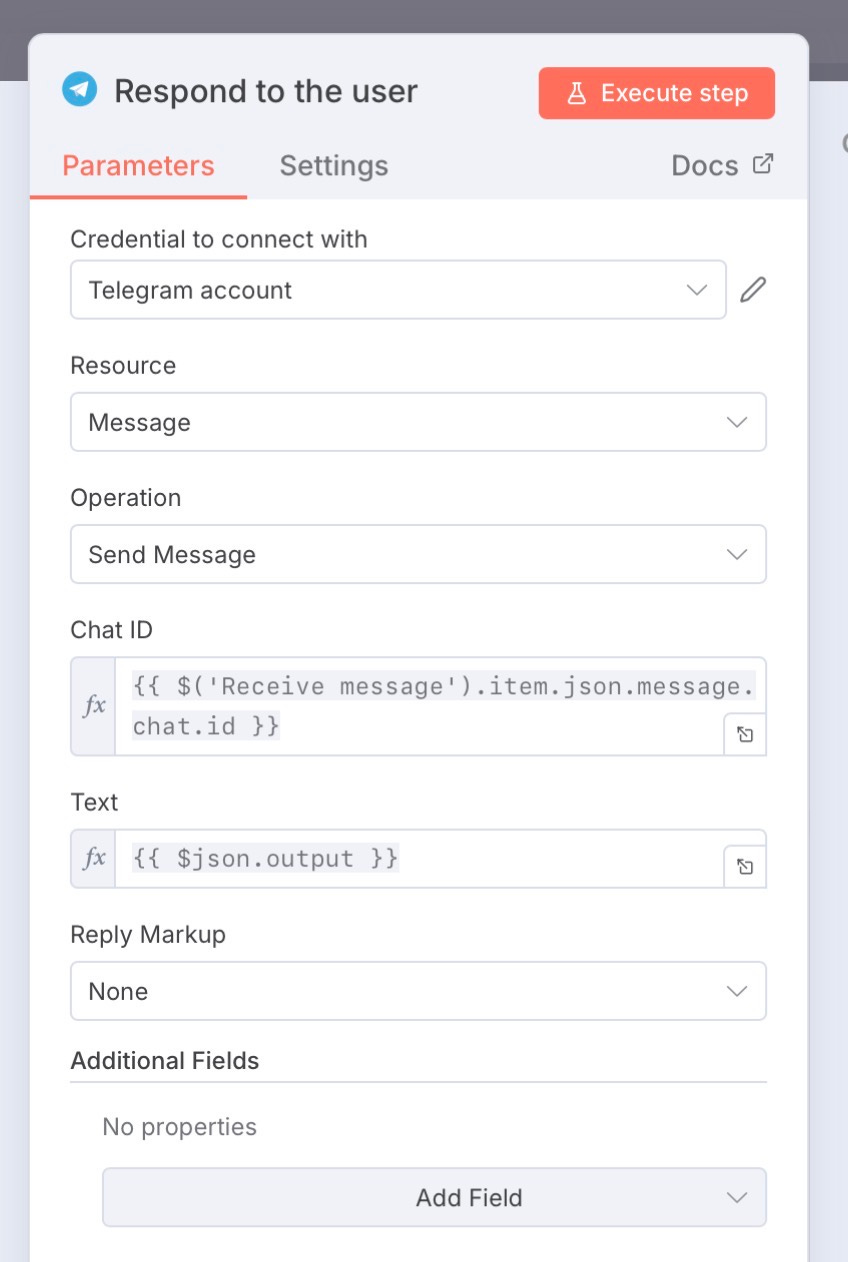 return { output }This is necessary because Telegram messages have a character limit and we want to avoid cutting anything off. Think of this node as a smart text buffer: it makes sure each piece is short enough to send.