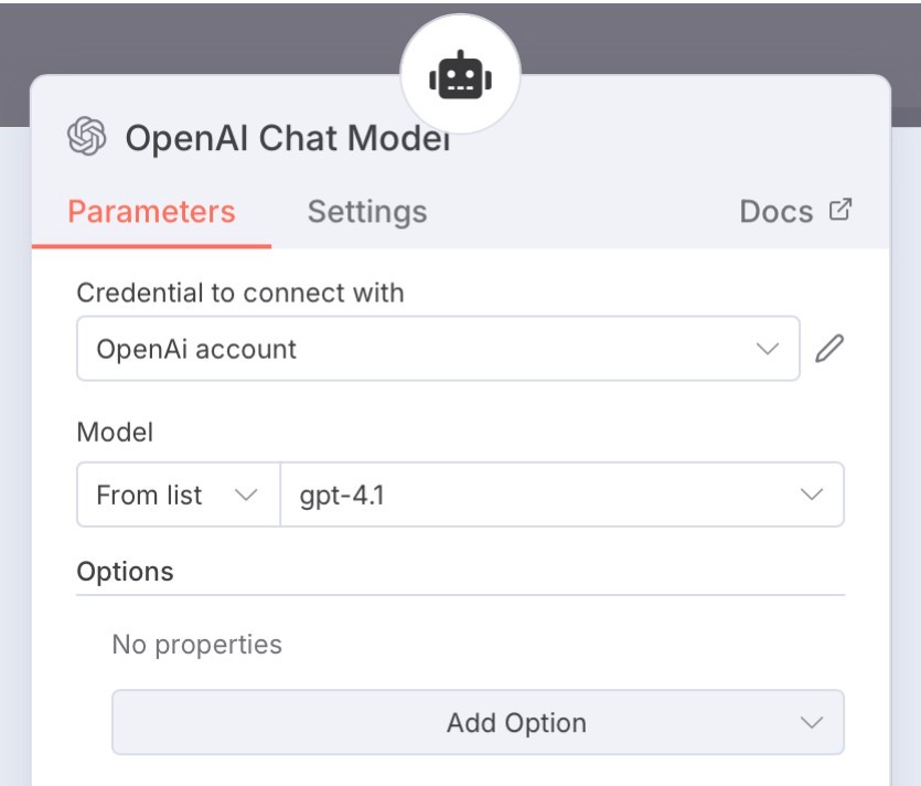 OpenAI Chat (GPT-4.1). This chat model node calls OpenAIโs chat completion (using GPT-4.1). It is the โbrainโ of the agent.