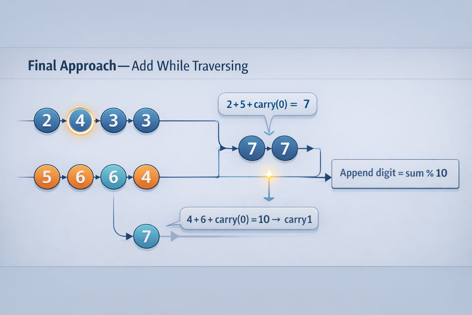 Where intuition often fails: candidates sometimes stop when both pointers are null and forget about a remaining carry. Or they try to handle carry with complicated branching instead of one consistent formula. The formula is your anchor under pressure.