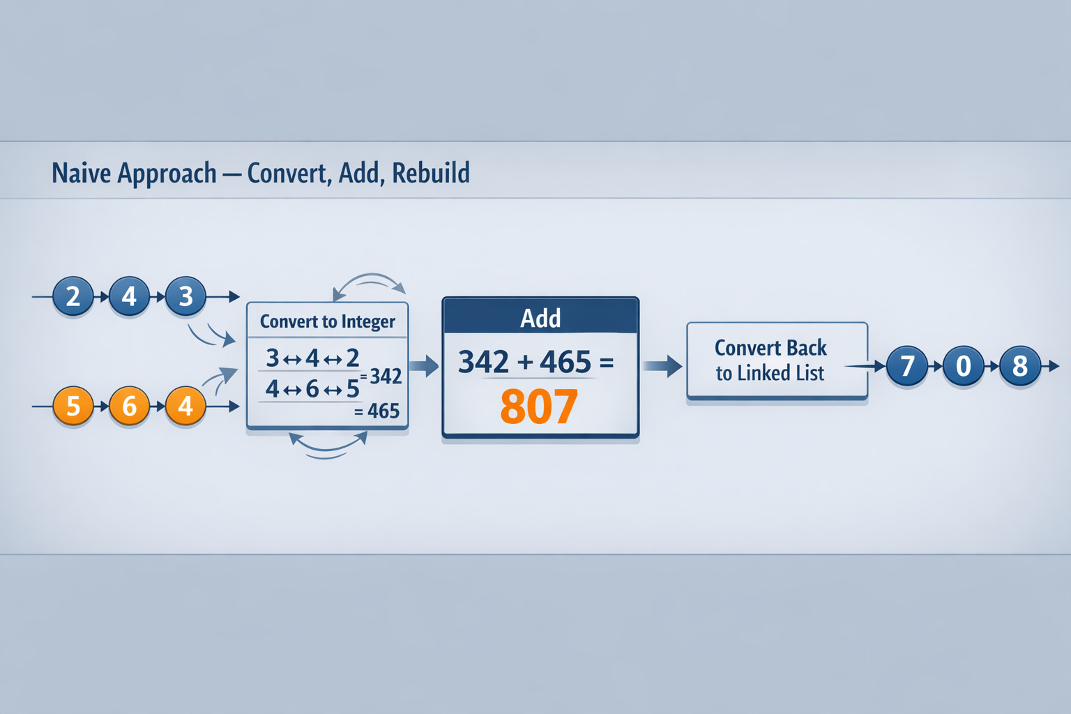 A strong candidate will often acknowledge the naive approach quickly - “We could convert, but that risks overflow and misses the point” - and then pivot to the real approach: simulate addition directly on the lists.