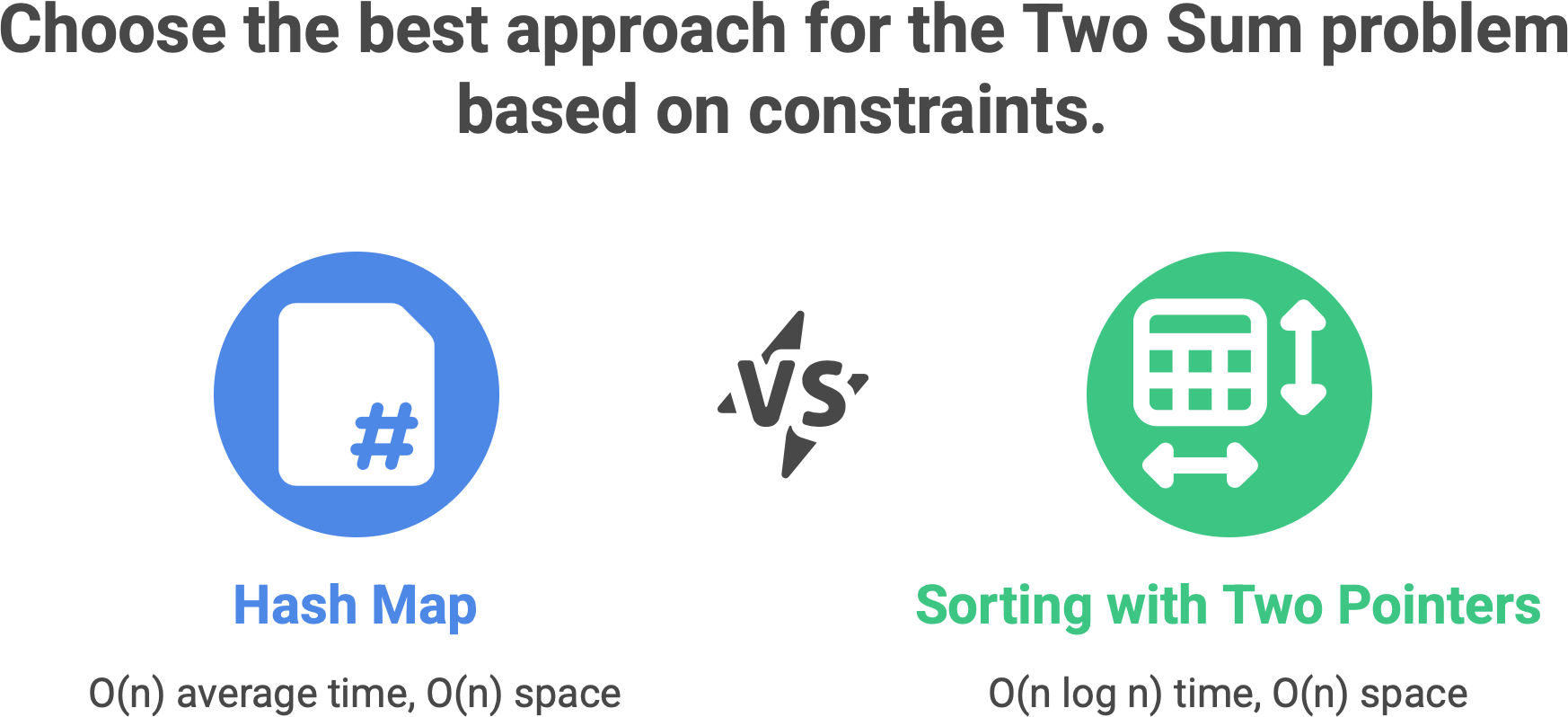 Finally, some candidates overcomplicate by sorting and using two pointers. That solution can be made correct by sorting (value, originalIndex) pairs, but it’s longer, easier to get wrong, and harder to narrate under time pressure. Unless the interviewer explicitly removes the hash map option (rare), sorting is usually not your best first move.