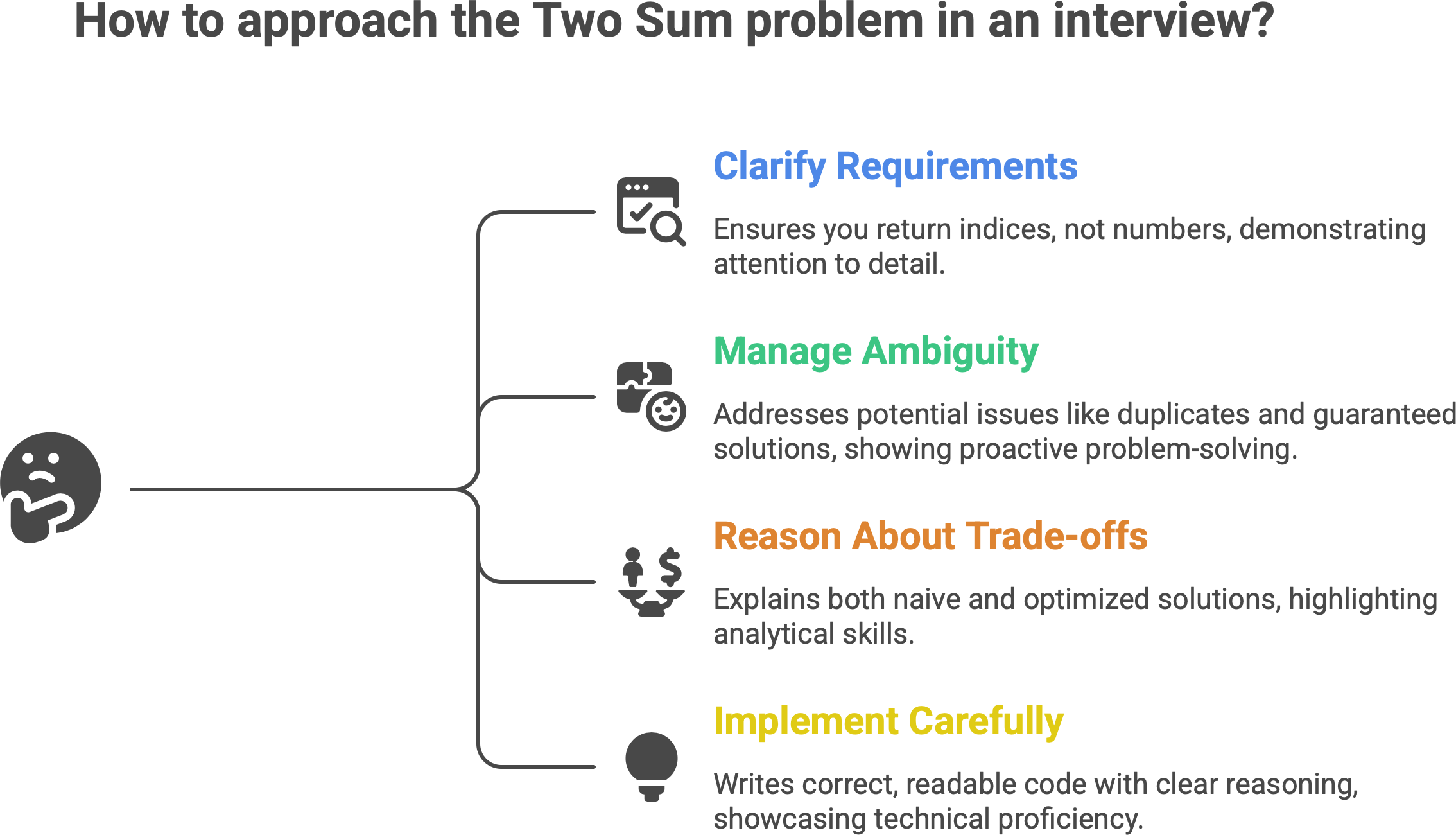 You implement carefully. The “optimal” idea is simple - a hash map lookup - but it’s also easy to get wrong with off-by-one mistakes, wrong insertion order, or duplicate handling. That’s the point: can you write correct, readable code while narrating your reasoning?
