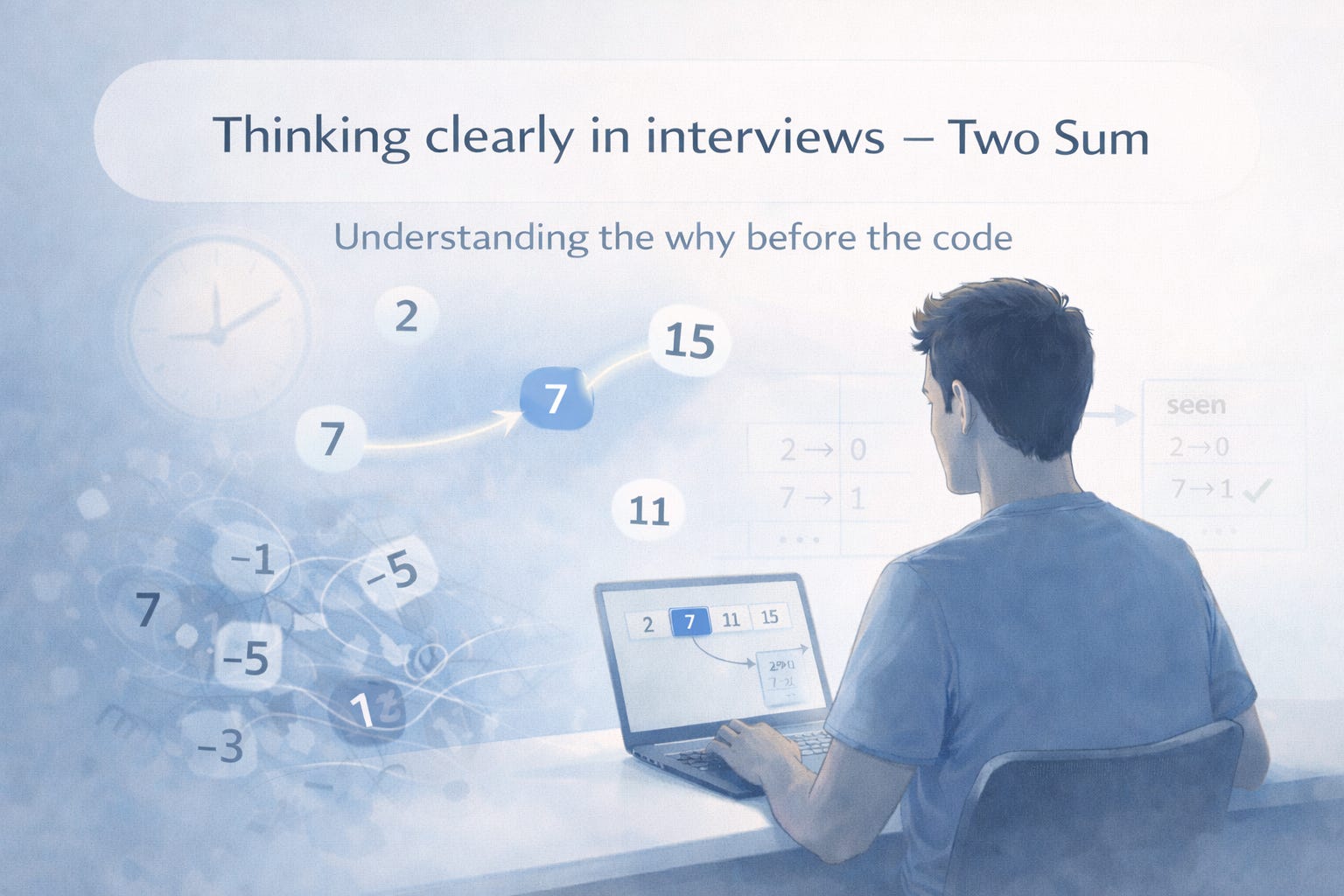 From an interviewer’s perspective, Two Sum is deceptively small. The statement fits in a couple of lines, the examples look friendly, and most candidates feel they “basically get it” within seconds. That’s exactly why it works: it creates a situation where it’s easy to start coding before you’ve demonstrated good engineering judgment.