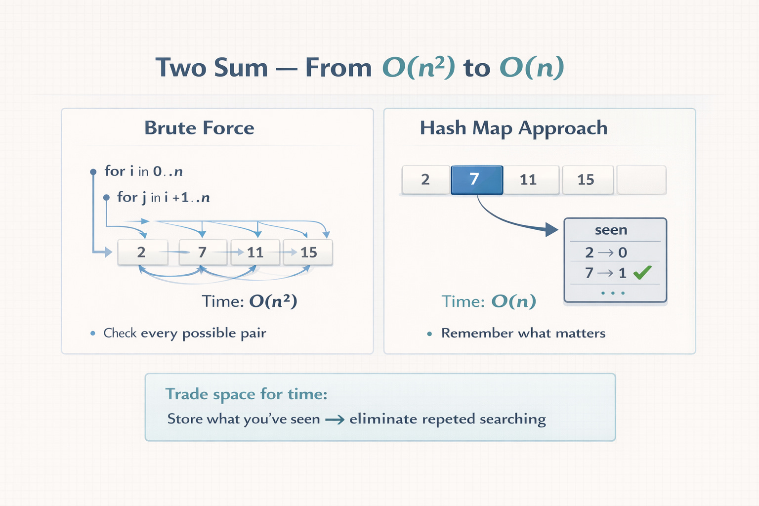 This is not about memorizing that “Two Sum uses a hash map”. It’s about noticing a pattern: you don’t need to search all pairs if you can transform the question into membership queries against a set of prior observations.