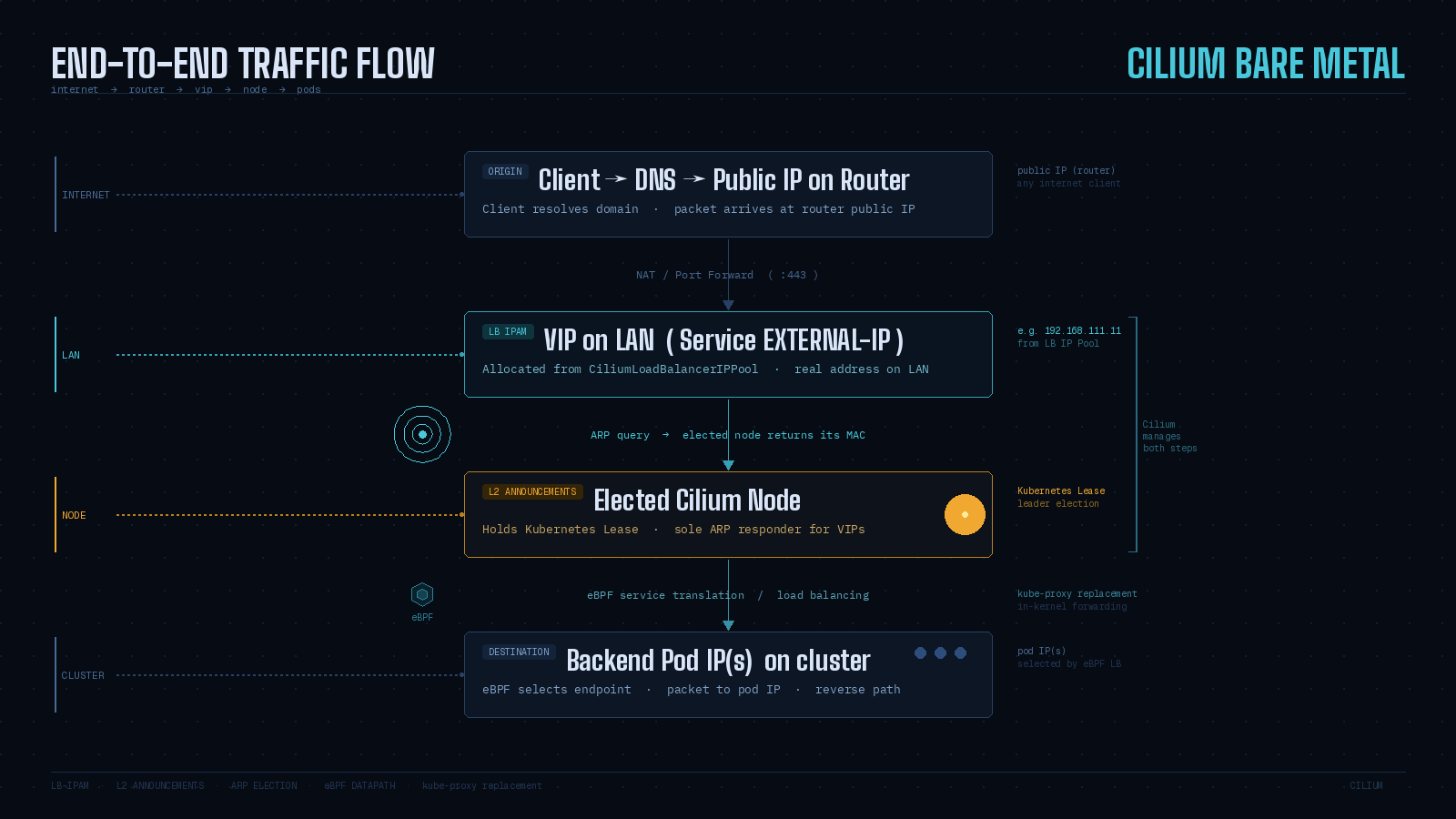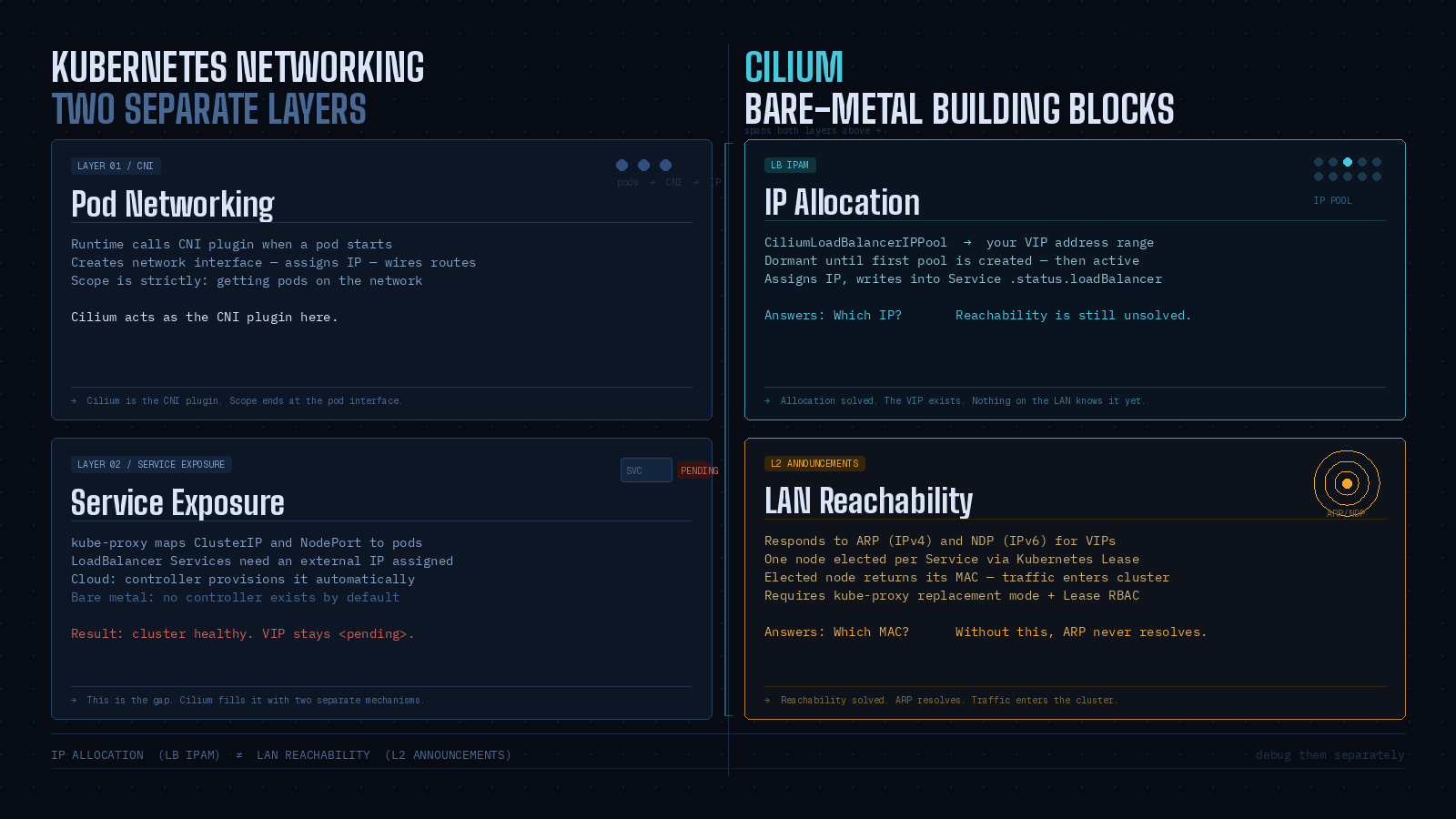 Cilium spans both layers. As a CNI plugin it handles pod networking. It also implements service load balancing in-kernel using its own datapath, and can run in kube-proxy replacement mode - a prerequisite for L2 Announcements. For bare metal specifically, Cilium provides two building blocks: